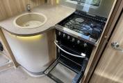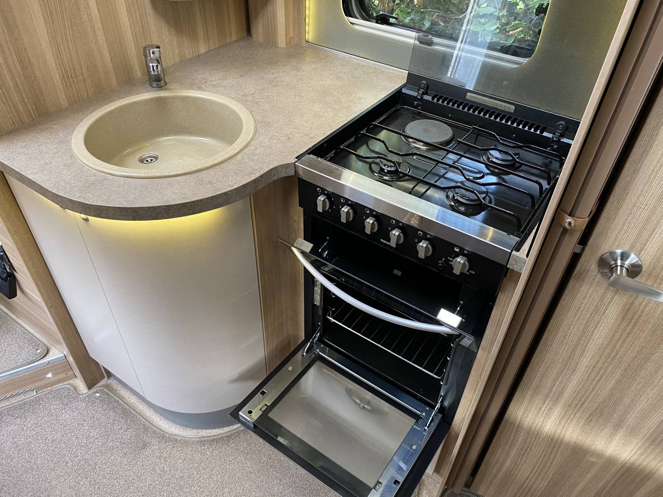 sink and chrome mixer tap, stowable drainer and chopping board, 3 gas burners and one 240v hotplate and below a Thetford grill and separate oven,