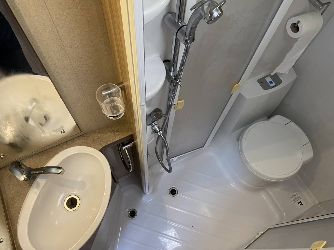 tap, Thetford cassette swivel toilet, a medicine cabinet, skylight and mirror.