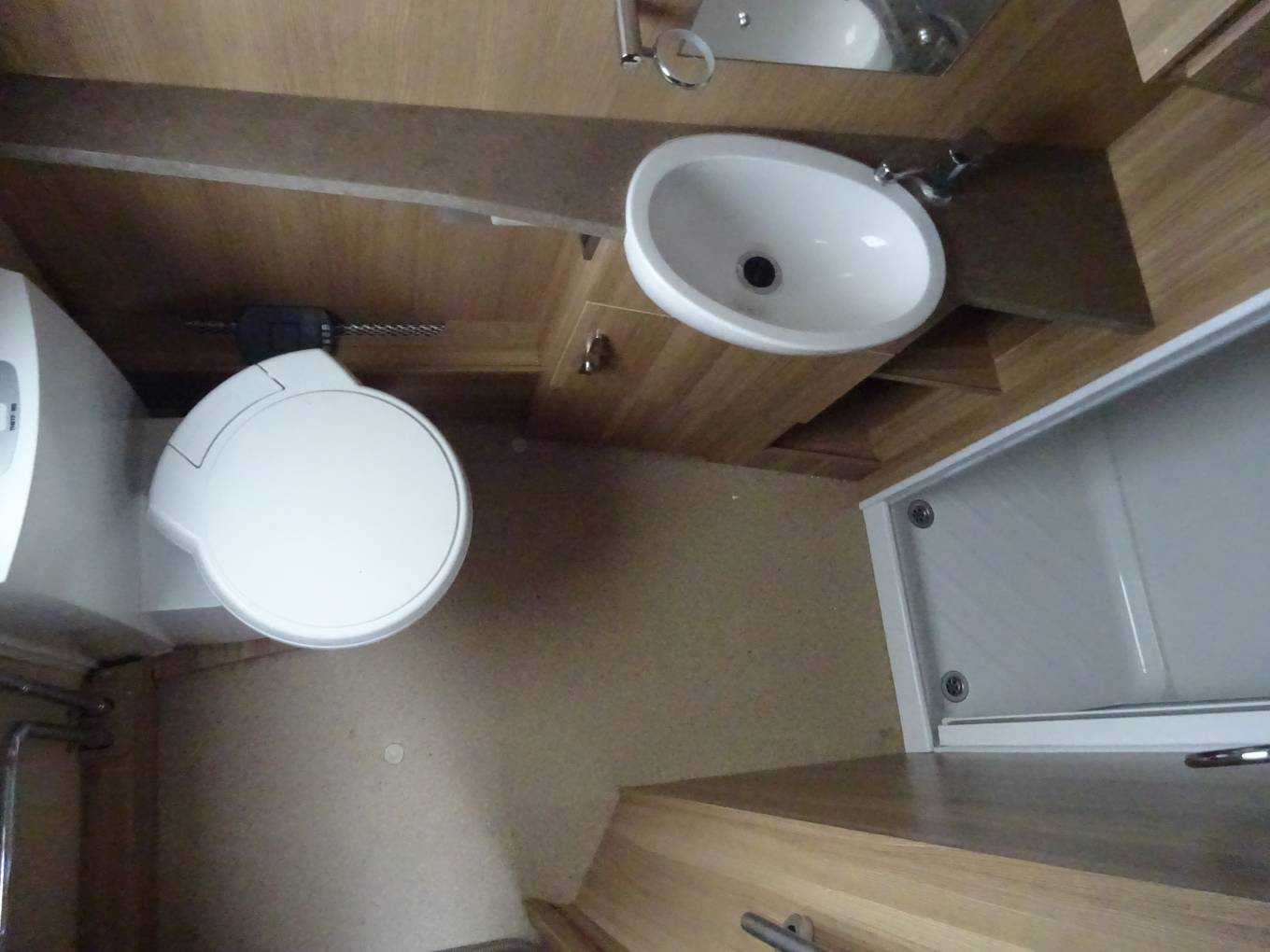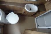 At the rear of the vehicle is a really large and modern bathroom featuring WC, Sink, Vanity unit and Shower.