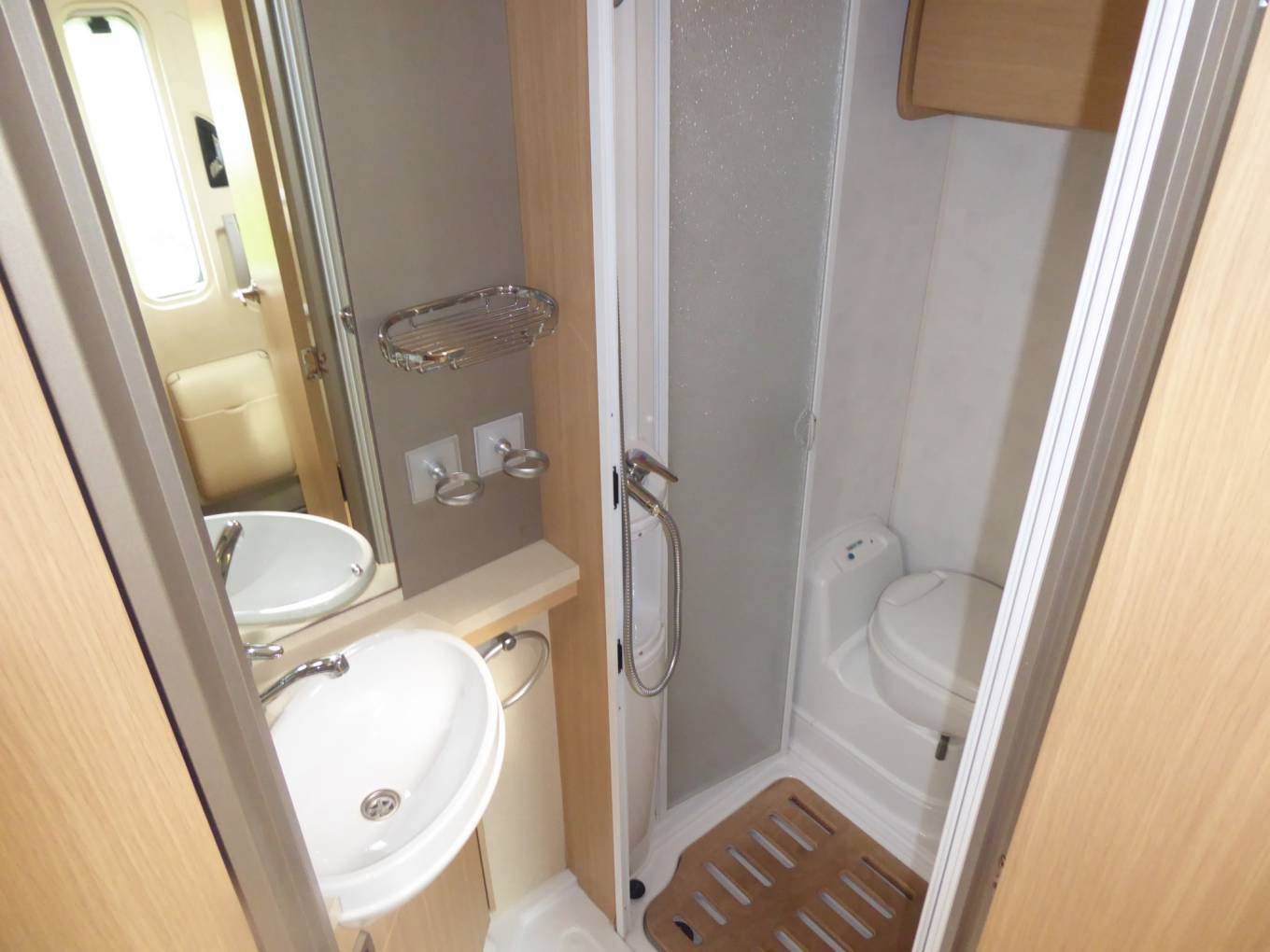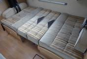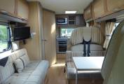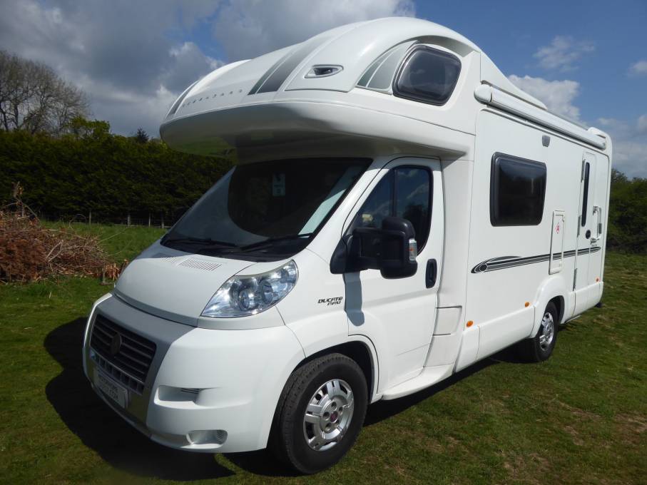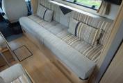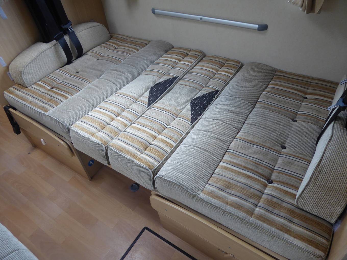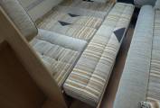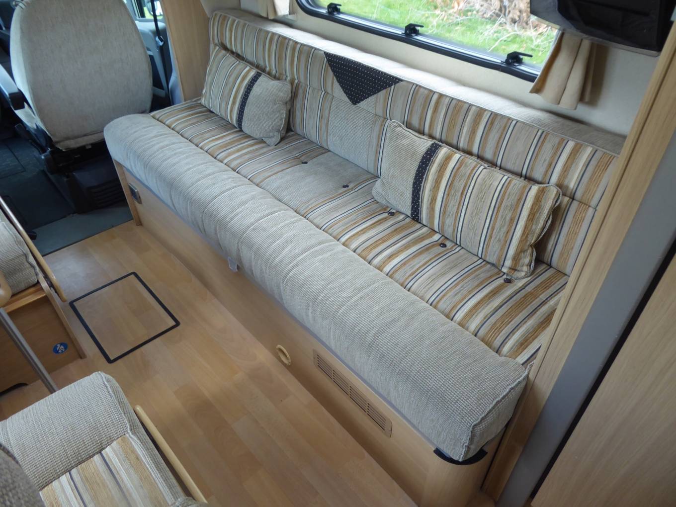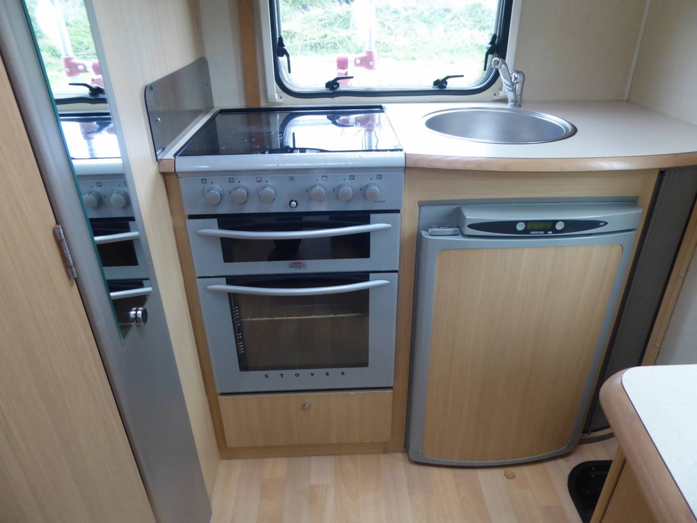 This attractive Bessacarr E635 sleeps 6 with a double overcab bed, a central dinette that converts to a double bed, and a single bench bed. It has a well equipped end kitchen with oven, grill, hob, microwave, and a fridge/freezer.