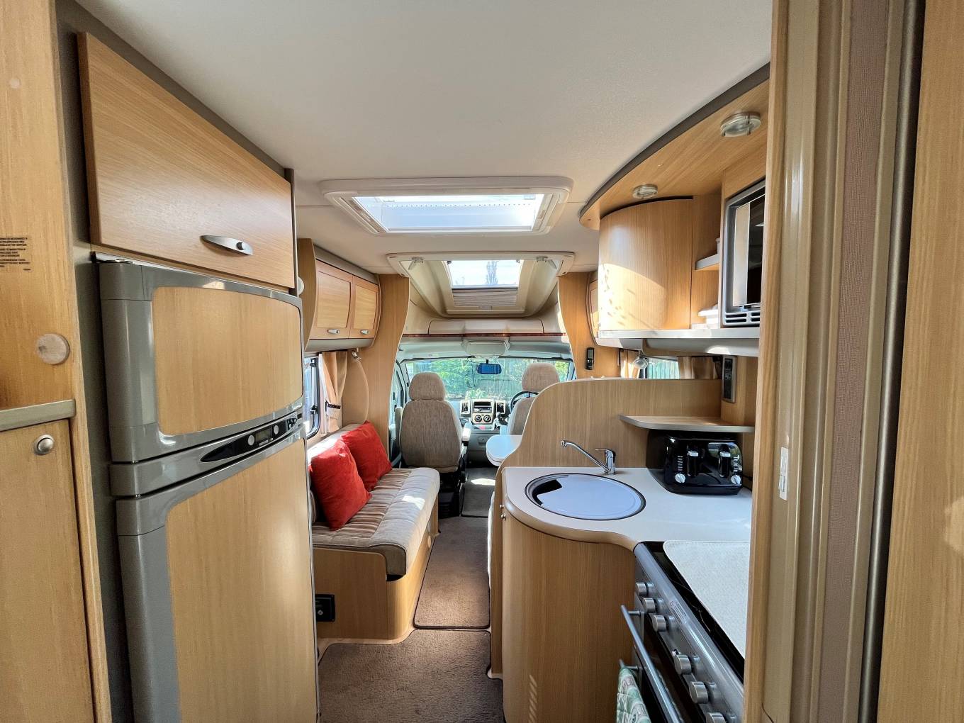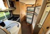 As you step through the habitation door, you are welcomed into the well equipped kitchen, its features being a circular sink with chrome mixer tap, directly below is the carousel cabinet, next is a three gas burner hob along with an electric hotplate, Thetford gas grill and separate oven, above is the microwave and opposite there is a large 3-way powered fridge with separate freezer unit above.