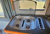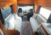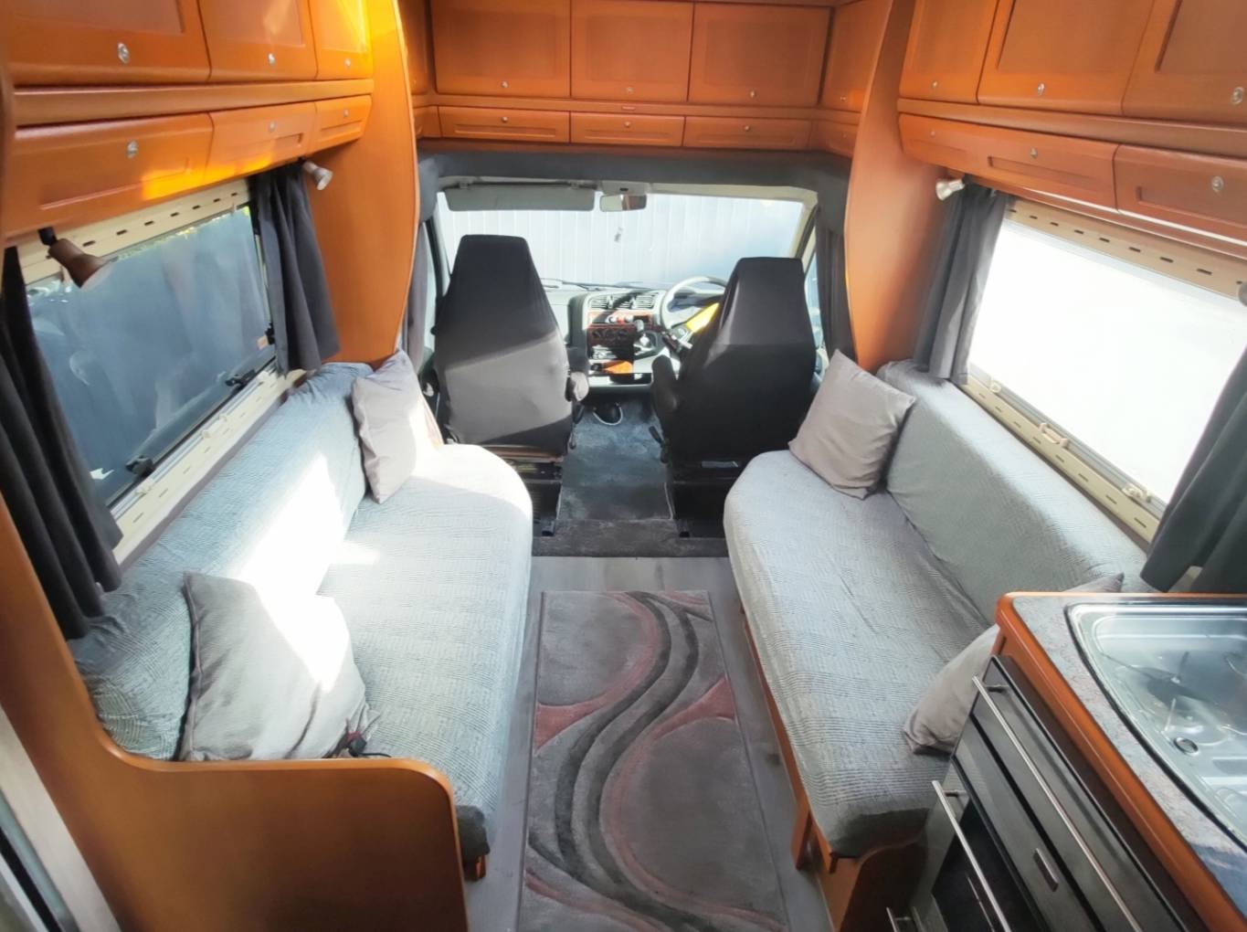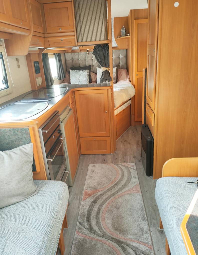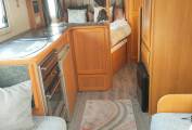 Moving to the inside, there is a front lounge with facing sofas and 2 swivel chairs ensuring there is enough room for at least 6 people to sit. An occasional swivelling table is a useful addition as well as a moveable dining table if more room is required. The sofas also easily make up into a double bed with copious amounts of storage above the front cab and lounge area. The side kitchen has all you will need - a sink with mixer tap, 4 burner gas hob, oven, grill and a 3 way fridge. The work surface has ample space for meal preparation with plenty of storage above and below.
