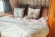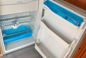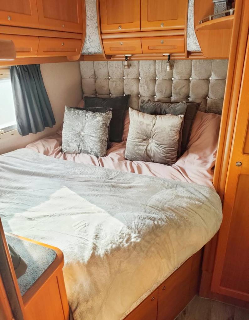 Going towards the rear of the vehicle there is a fixed double French bed with plenty of storage above the bed and a vanity unit with basin, to the side. The separate washroom has a cassette toilet and shower, curtain. Blown air heating is also provided, via a Truma Ultraheat system, for the cold nights.