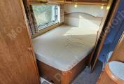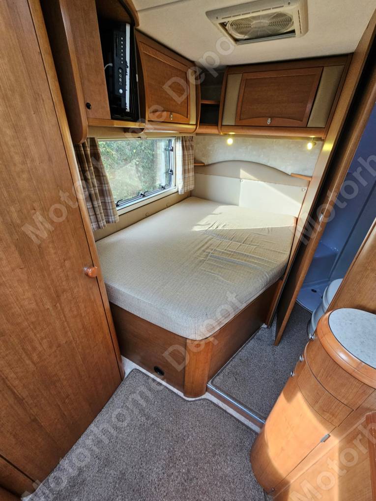 There is a large fixed double bed at the rear with high level storage and a TV at the foot of the bed.