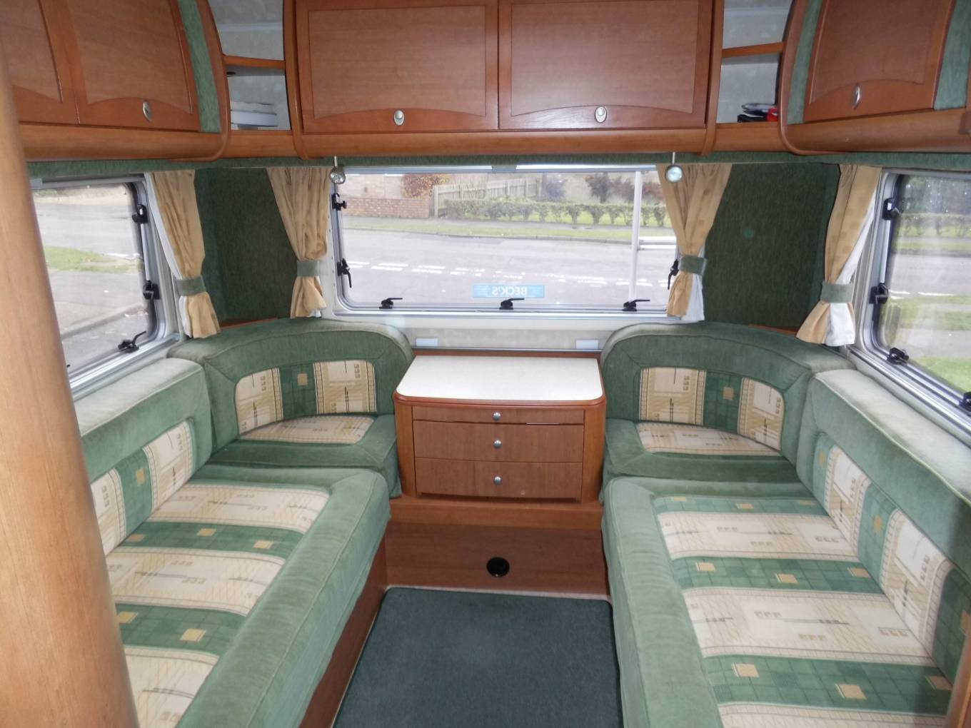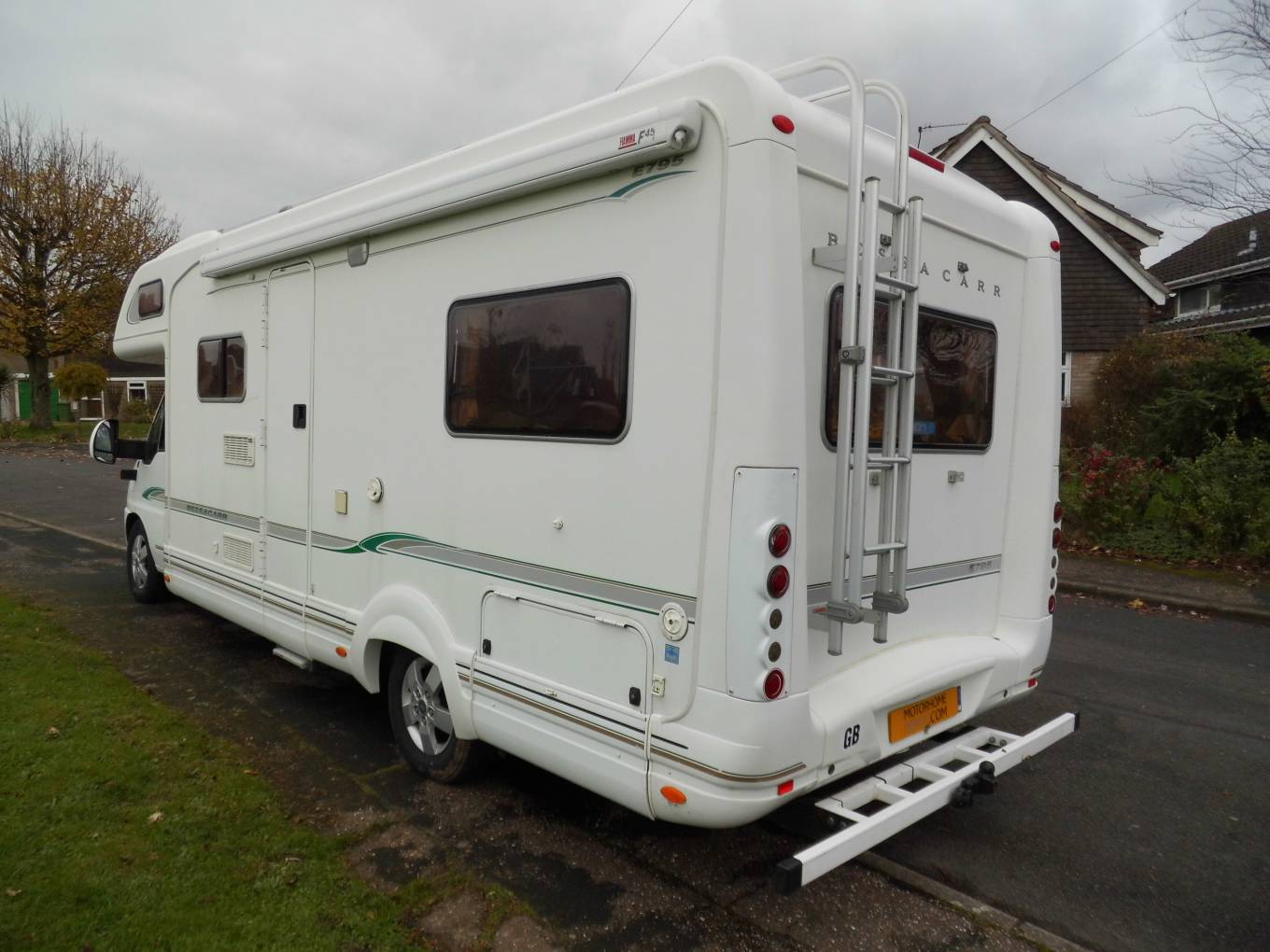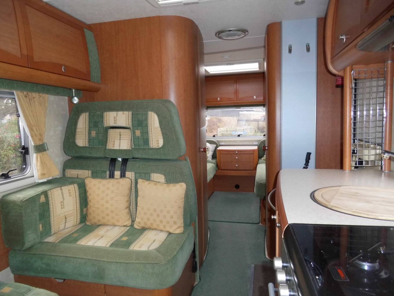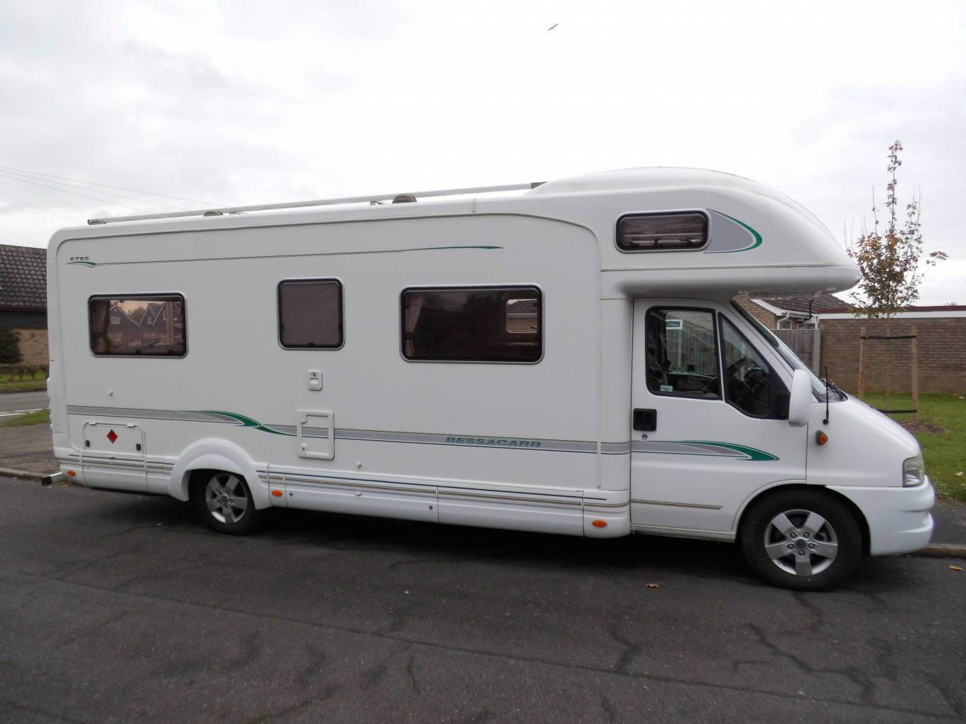 BESSACARR E795 2003 6 berth coach built motor home has a 2.8 litre diesel engine with a 5 speed manual gearbox and 4 seat belts. This an excellent motorhome for families. On entering the side of the motor home you will walk into the front dining / lounge area this area also converts into a good sized double bed to the front the over cabin bed is also a good size bed. Both captain seats swivel making this an ideal socialising area. Turning Left in the motor home there is a kitchen consisting of grill, gas hobs and one electric hob, fridge with a small freezer compartment, sink and drainer. To the middle of the motor home there is a large washroom with window, toilet,washbasin and separate shower. To the back there is a really good U shaped lounge area that also turns in a double bed making this a great family motorhome. This giving you two good separate areas for socialising and dining. Each window has fly screens and blackout blinds. This motor home comes with lots of storage space and Towbar.