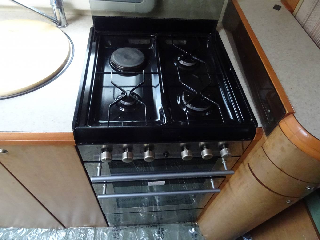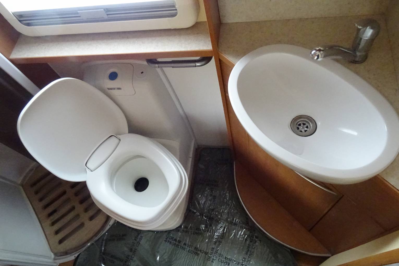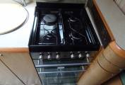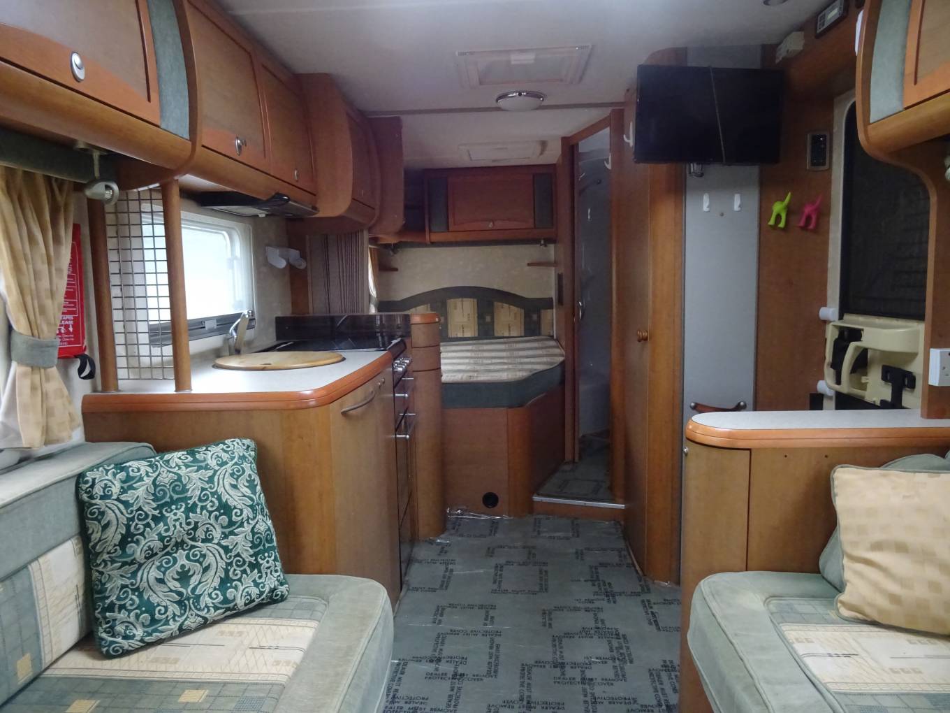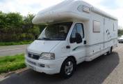 Stepping inside the Bessacarr we find a fixed french double bed at the rear with a large washroom adjacent, which has a seperate shower with a hard curved screen, a Thetford swivel toilet and a single bowl oval sink. A large wardrobe is also provided and this area has a partion which creates an on-suite bedroom when drawn. The kitchen is centrally located and is very well equiped with an oven and seperate grill, a hob with 3-gas rings and an electric hot plate, a Dometic 3-way fridge with a freezer box, a round stainless steel sink and a microwave oven. The bench style seating in the lounge converts into a very large double bed with the remaining two berths provided by the over-cab pull down double bed. An oblong table, which is stored in the wardrobe, can easily cater for six people at meal times and extra seating is available using the two captain seats. A swivel bracket mounted TV is available with a purpose built cabinet, and it can access satellite tv as well as having an aerial connection. There is plenty of storage space in this motorhome with airline style lockers, under bed and seating space and loads of cabinets, and of course, the large wardrobe.