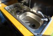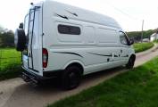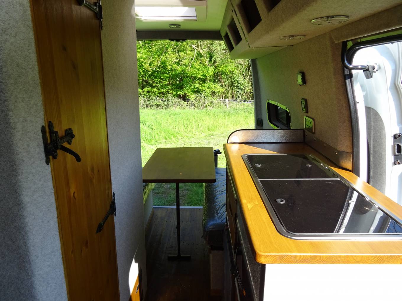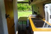 It has been converted to be a 2 berth 2 travel belt campervan and configured for off-grid use as well as on-site. With 2 105 Ah leisure batteries, solar panel, gas bottle, diesel heating - 5kW, large 65L fresh water tank, washroom with shower, 45L wastewater tank, electric flush cassette toilet, inverter, it has been well insulated and has a solid wood floor. The 2 berths are made up from the rear lounge bench seats. The kitchen area features a 2 ring gas burner hob, sink, small fridge and oven/grill.