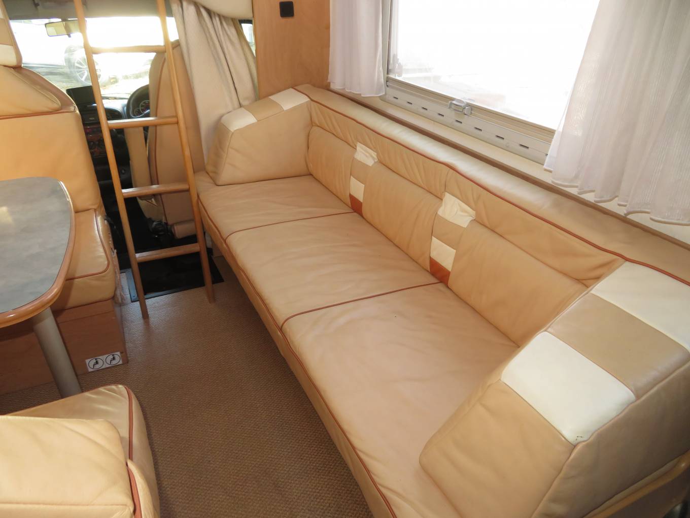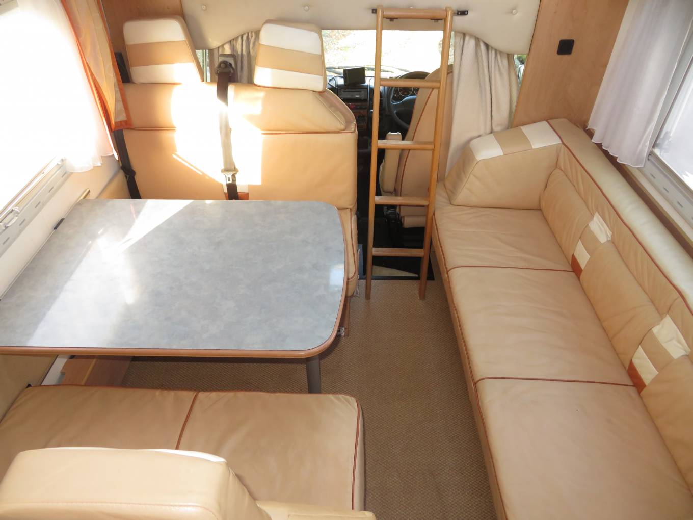 The motorhome has an excellent living and sleeping area. At the front you have a spacious and comfortable lounge/dinning area which is a great place to sit and relax during the day. There is an extremely well equipped kitchen that features oven, grill, gas hob, sink with mixer tap and large fridge with freezer compartment. The Burstner A-747 is so comfortable for sleeping, it has one large double over the cab, another large transverse double bed over the rear garage and the lounge/dinning area that can be made into further beds. It has a centrally located washroom that features a flush cassette toilet, sink and most importantly a separate shower. As we have come to expect from German builds you can enjoy superior insulation with a double skinned floor - making this motorhome perfect for winter as well as summer use. The motorhome has excellent heating system including an integrated underfloor air heating and cooling system, exiting around beds and the living area. There is a custom made carpet for the living area and full size mirror in hall and mirrored cabinet in the washroom.