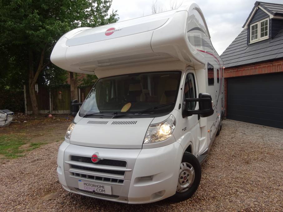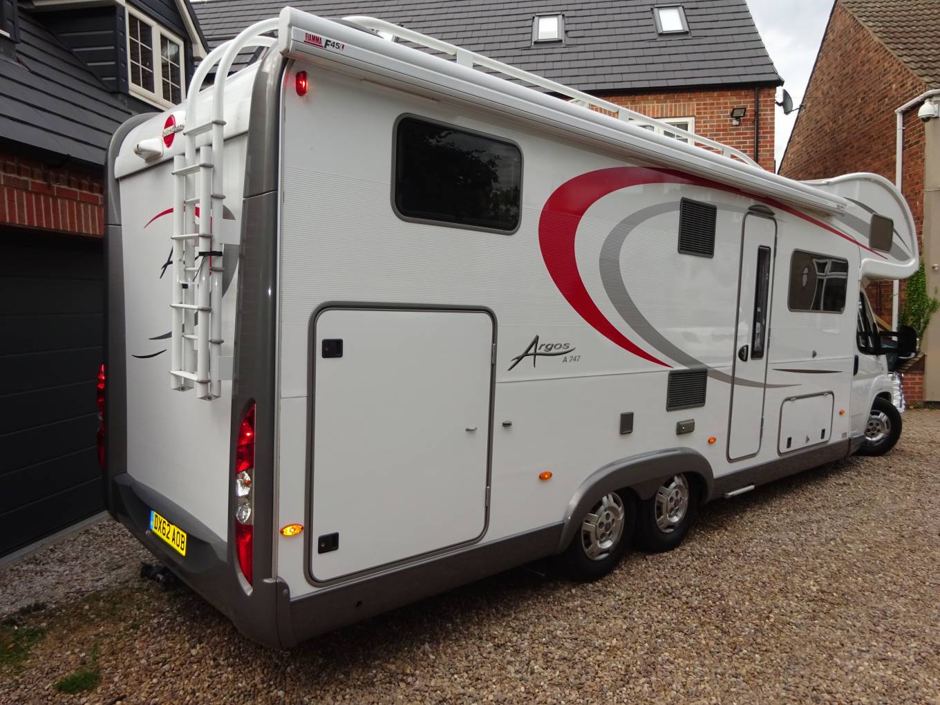 A Stunning example of the stylish 2012 Burstner Argos A 747 - 2 G, based on the Fiat Chassis with 3ltr, 180Bhp 6 Speed Manual Gearbox. This very well equipped and spacious motorhome comes with a Transverse bed over a large rear garage. The Garage measures 1145mm high, 850mm wide and 2180mm deep. The over cab bed is very spacious along with the dinette area and bench seat. There are 6 x 3 point seat belts in the motorhome. The L-shape kitchen comes with Four ring gas hob, oven, grill, microwave, fridge and separate freezer. The side bathroom comes with a toilet and basin with a separate shower room, Alde heating, tracker system, Thatcham approved alarm system, new batteries, satellite system, 2 Tvs, wind breaks for the awning, cab air con, cruise control, Fsh. Led lighting throughout the motorhome.