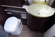 side with a swivel head fresh water flush loo, a large oval sink to the right