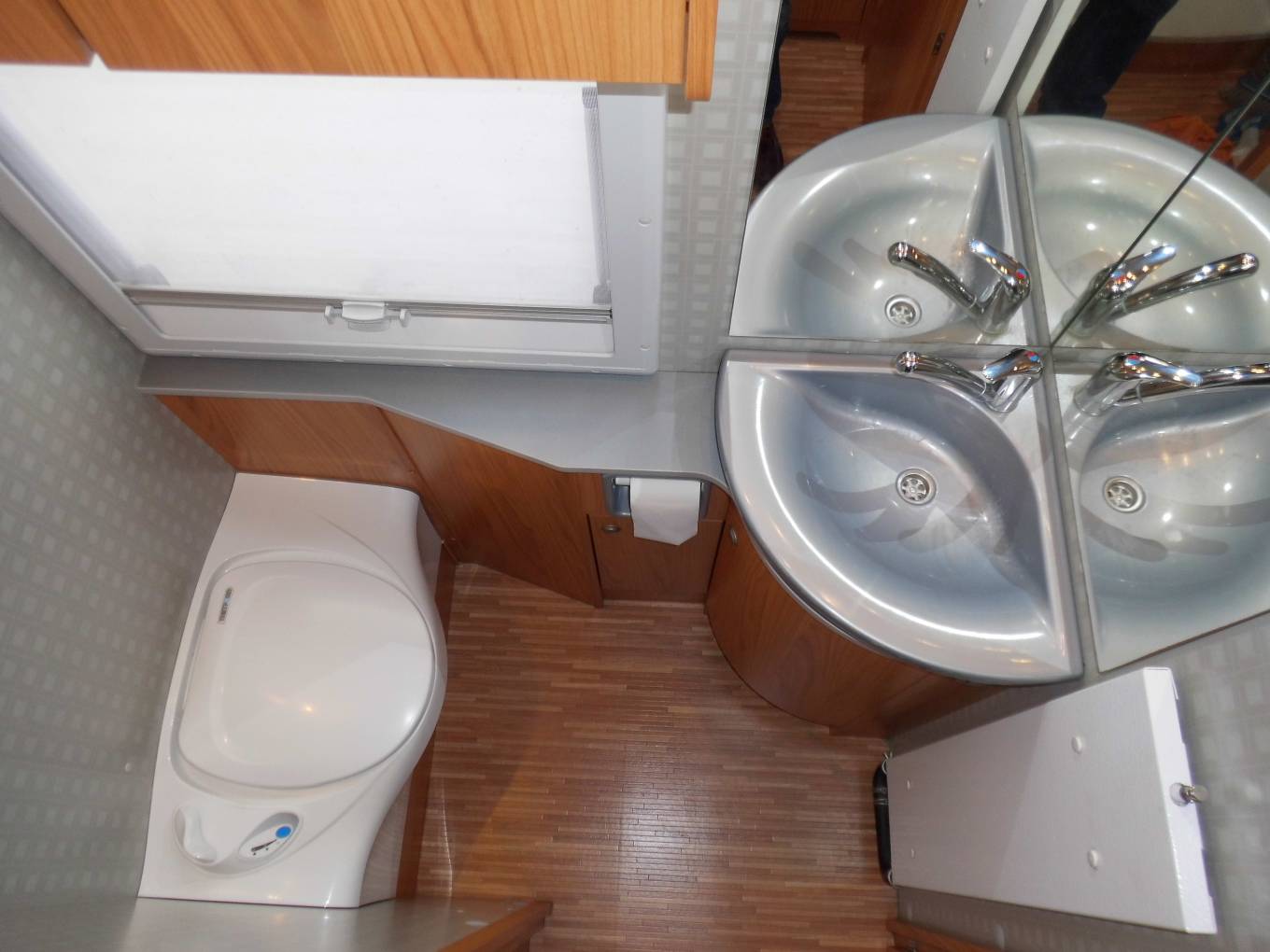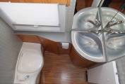 The mid washroom has a vanity washbasin with a chrome mixer tap, a Thetford cassette toilet, a medicine cabinet, mirror, Alde heating unit and with an opaque opening window. Across the hallway is the popular separate shower cubicle, the washroom door also closes across the aisle to give privacy to the rear of the motorhome.