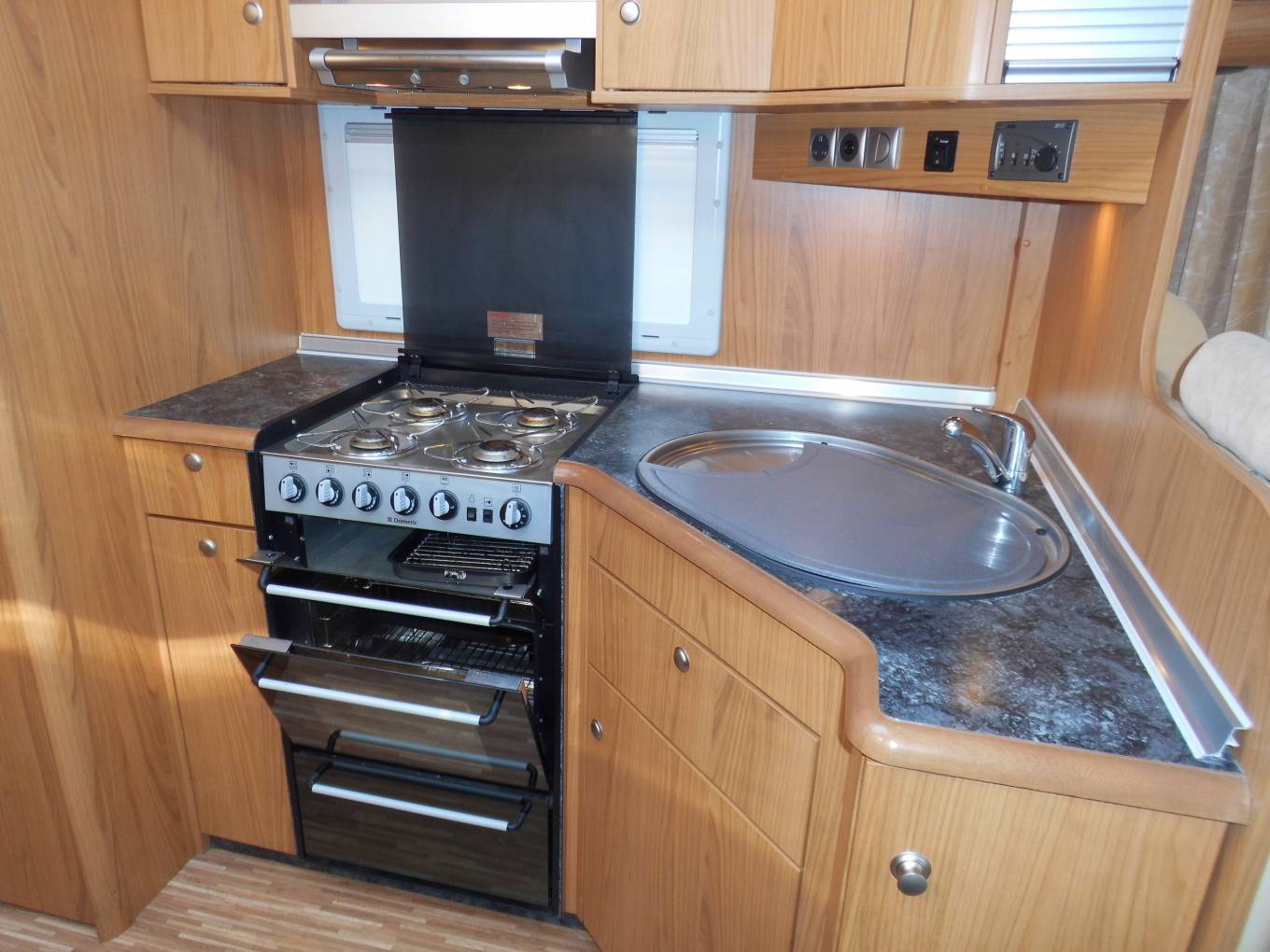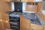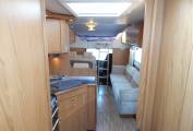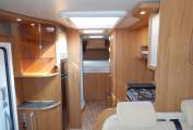 Enter through the habitation door and you have the kitchen in front of you, including a good sized circular sink with drainer and mixer tap, a four gas burner hob and below a Dometic gas grill and oven, there is a large automatic energy selection Dometic fridge with separate freezer box above, a microwave and plenty of work surface and storage cabinets throughout.