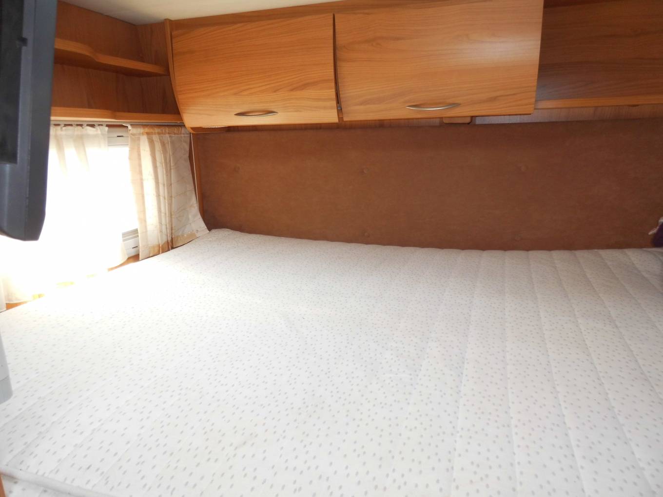 The rear tranverse generous sized double bed is accessed via two folding steps and this rest area includes plenty of storage and an Acura TV.