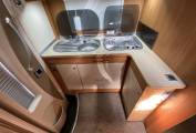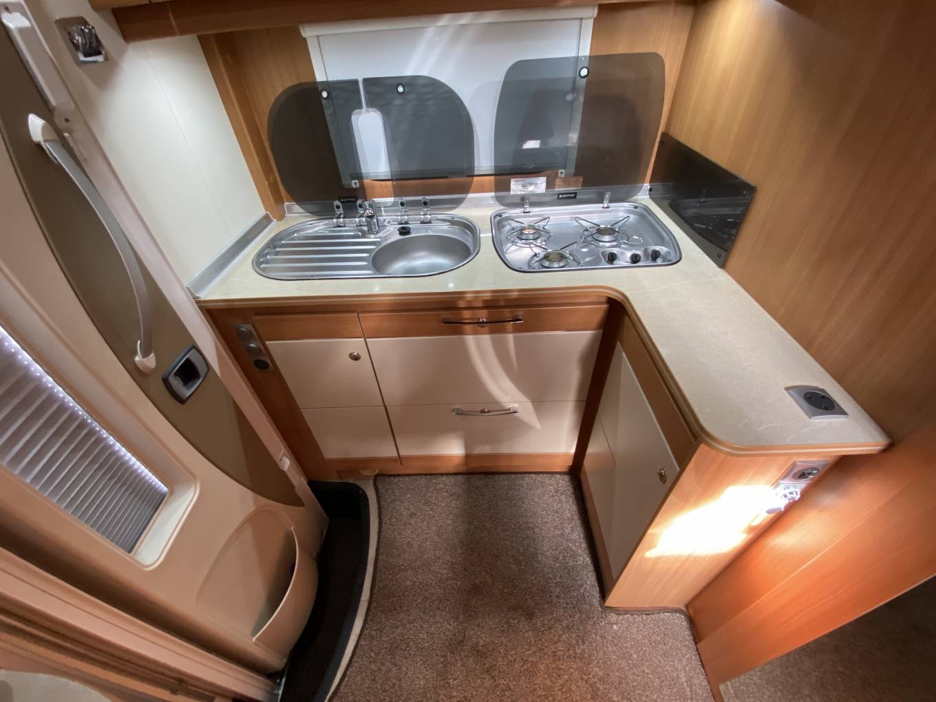 On entering via the habitation door, to your left, at the rear of the motorhome is the kitchen area where you will find a three burner hob, a sink with hot and cold water supply and a draining board plus plenty of cupboard space and worktop area.
