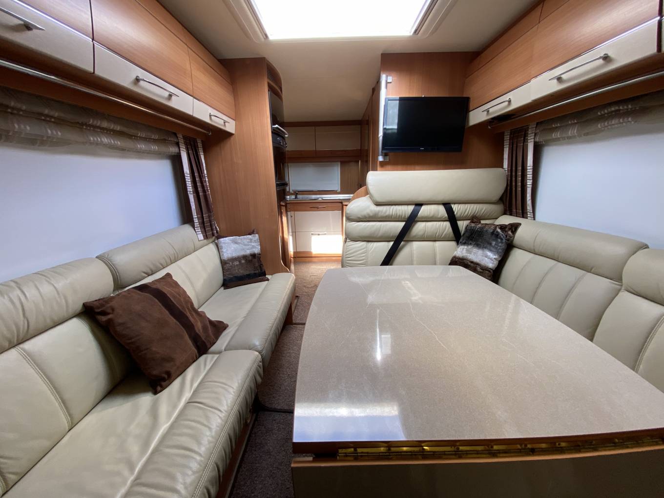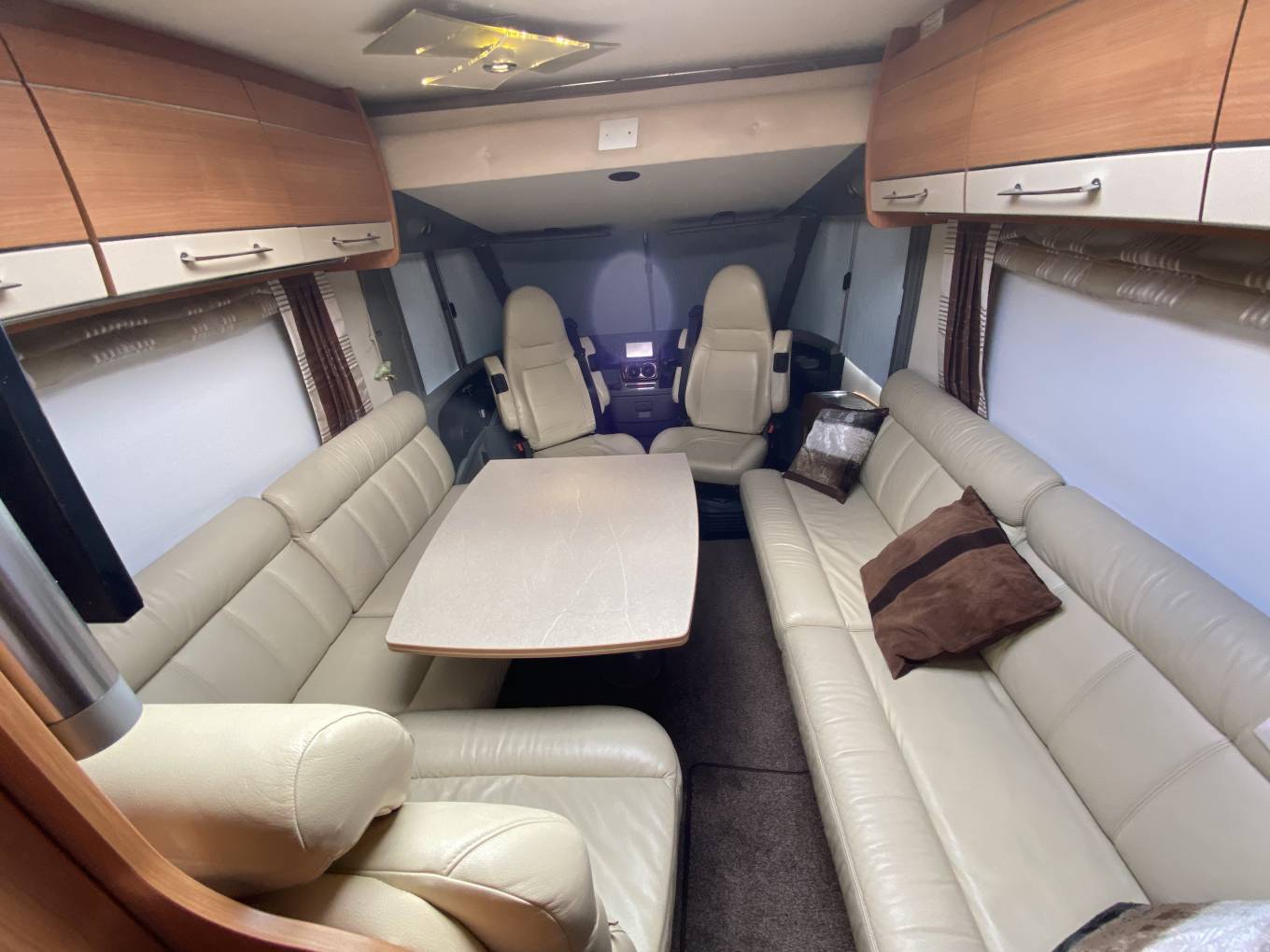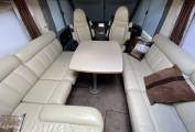 The central lounge has twin inward facing settees, twin forward facing belted seats and a pair of swivelling Captain’s Chairs.
