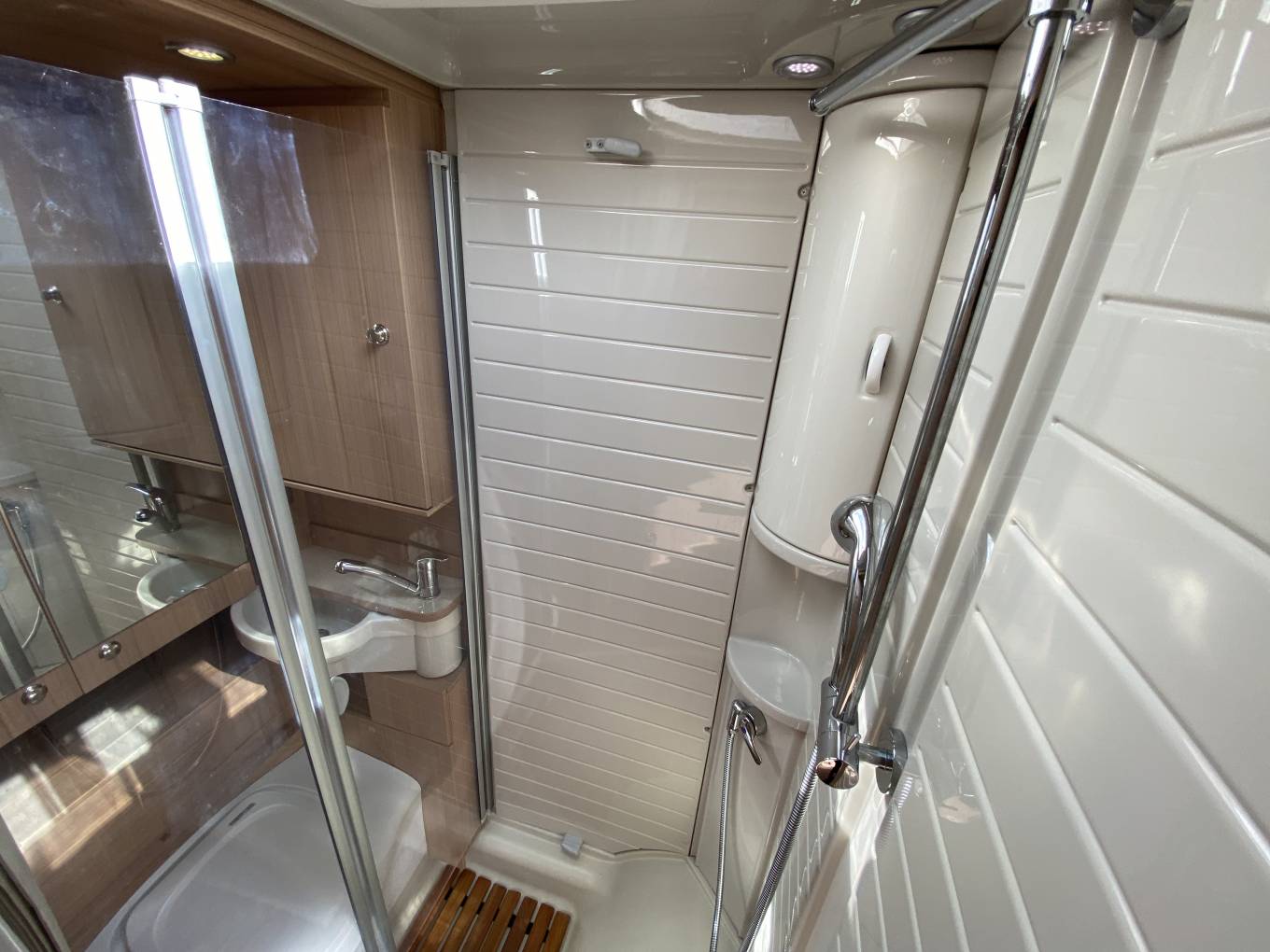 In the far corner is the useful Bathroom with a large capacity Thetford Cassette Toilet, Swing out Wash Hand Basin and a folding dividing door creating a separate shower area.