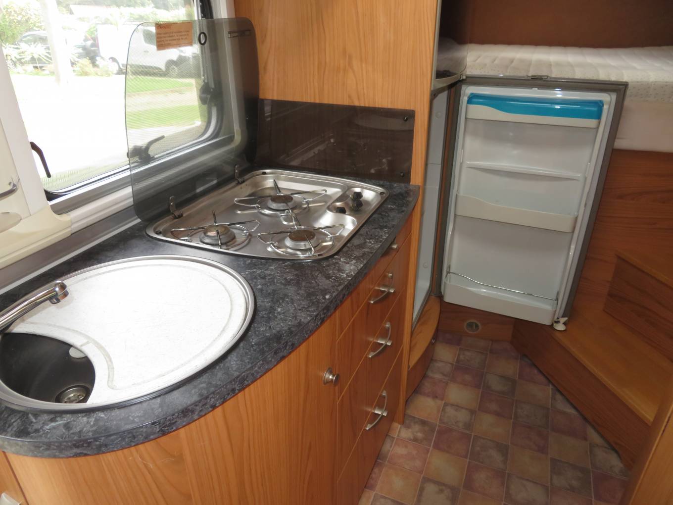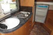 The A-Class i675 is built with comfort and space in mind and as a result has an excellent habitation area. At the front of the motorhome you have two swivel seats, one front facing double sofa and a further single side sofa to create a fantastic lounge area. There is also a removable side fixing table that is an ideal place to enjoy snack or drink. This table can be expanded further to create a large dining area for up to 5 people. The Burstner comes with a well equipped kitchen which includes and oven, gas hob with 3 gas burners, sink with mixer tap, and large fridge with separate freezer.