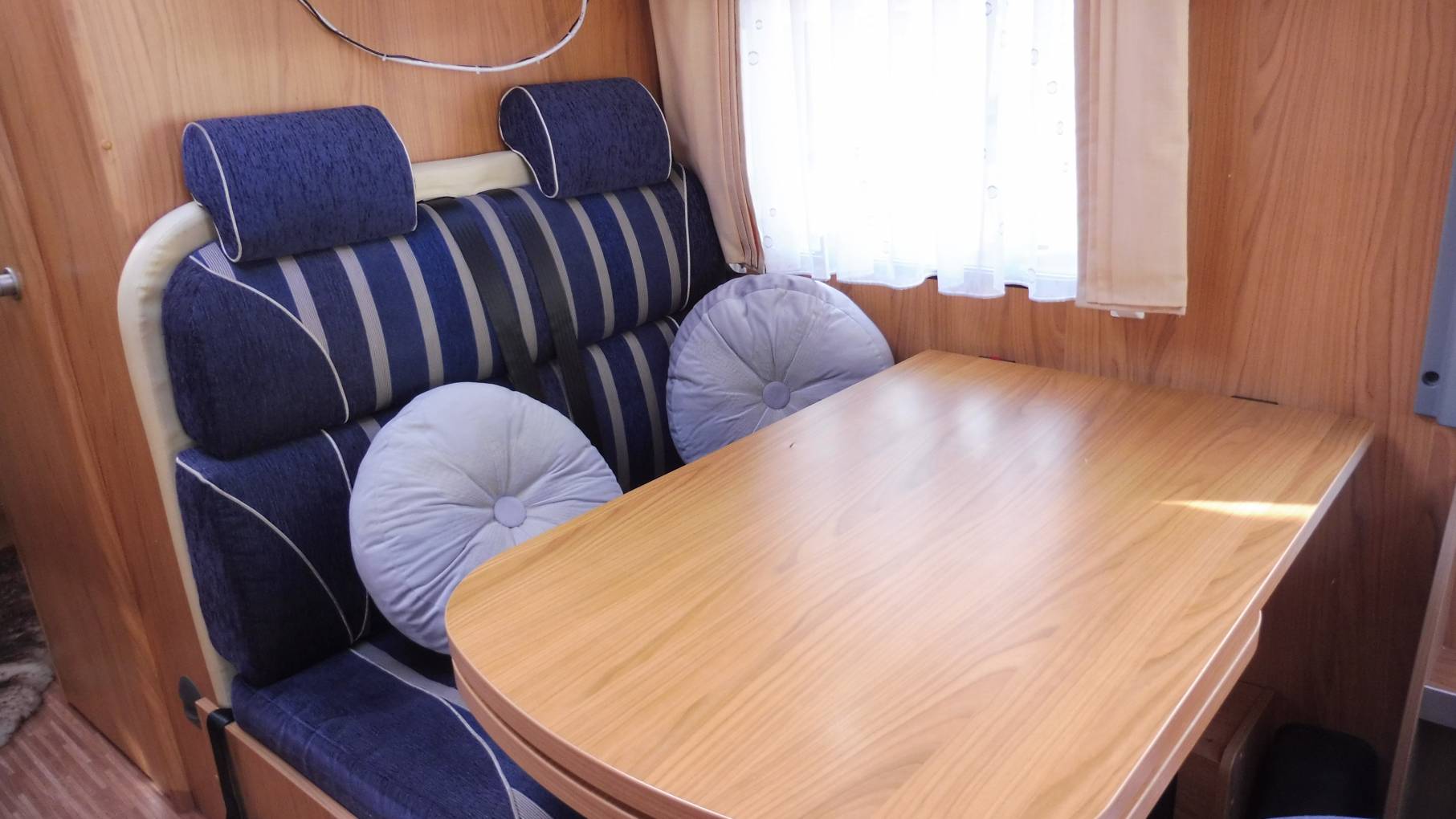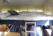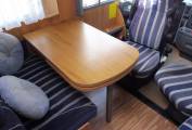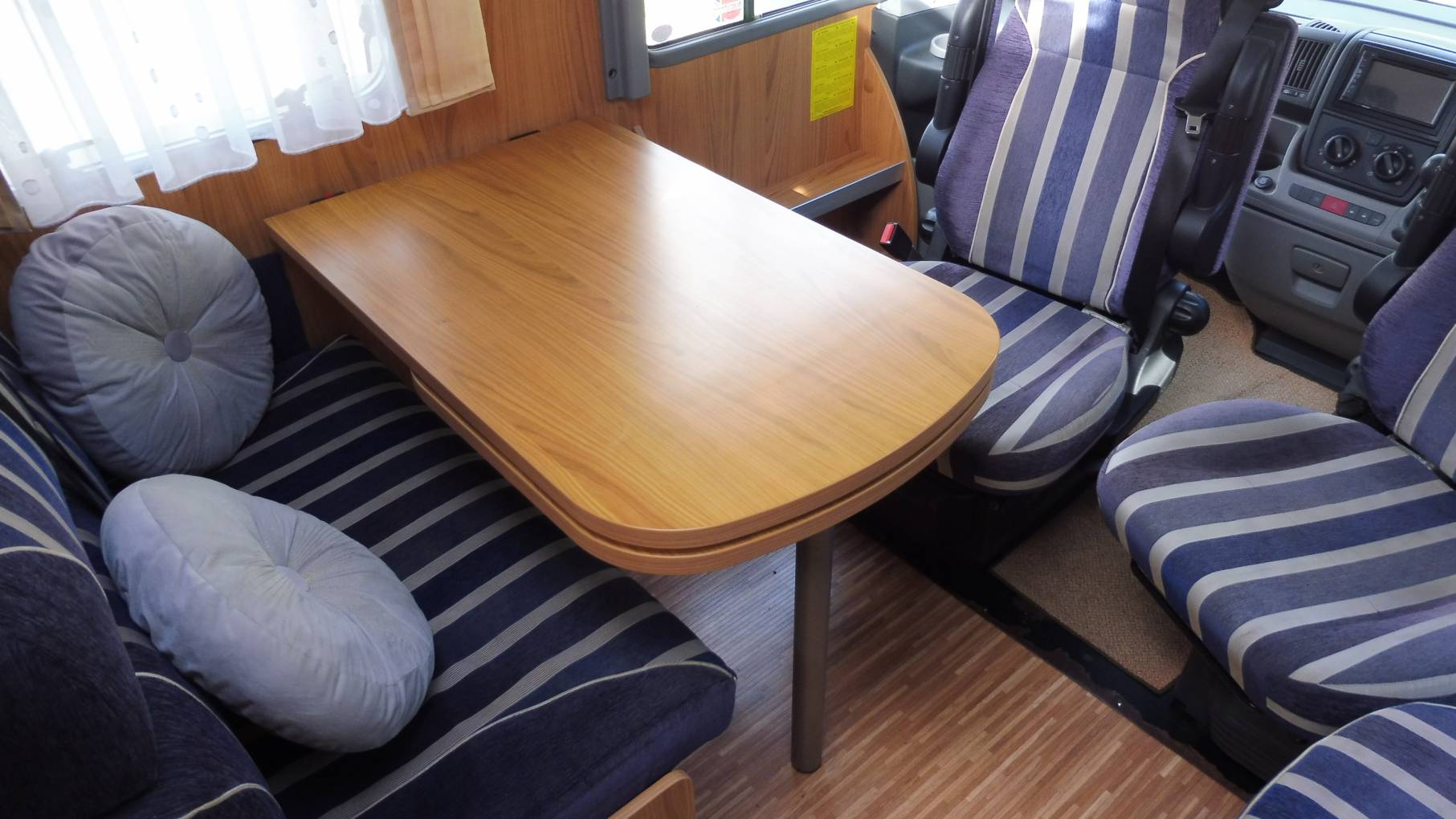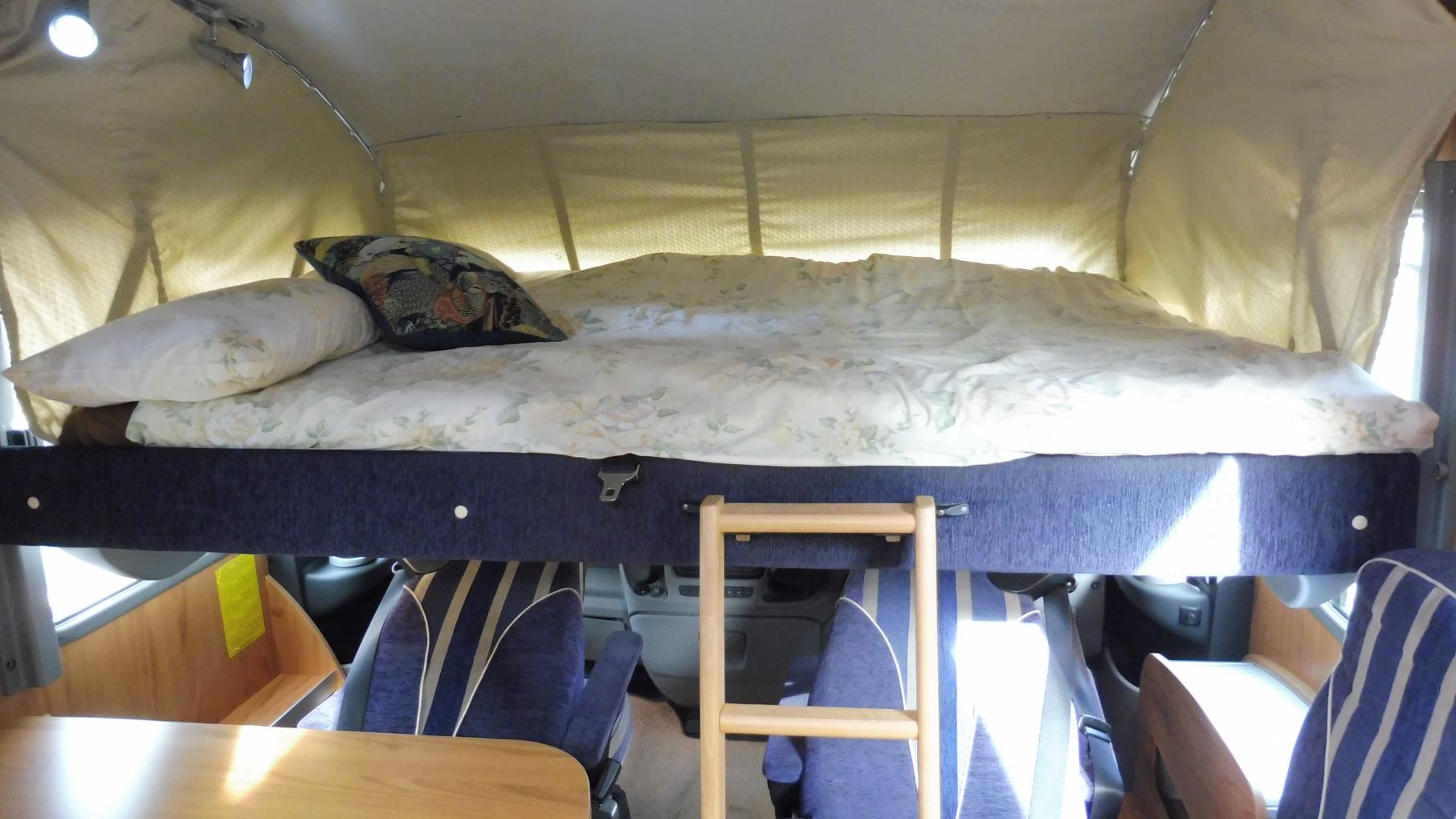Enter using the electric step and the lounge and dining area is to your right, with two forward facing seats both with 3-point seat belts, a side seat and a large dining table that easily extends, both front seats swivel to face the habitation area, plus a large wind-up sunroof floods the lounge with plenty of natural daylight. The over-cab bed pulls down on gas struts, it's large and spacious and there's a wooden ladder to give access.