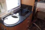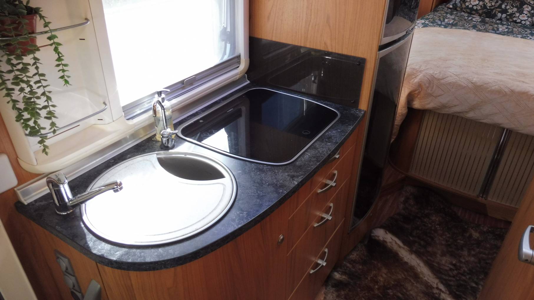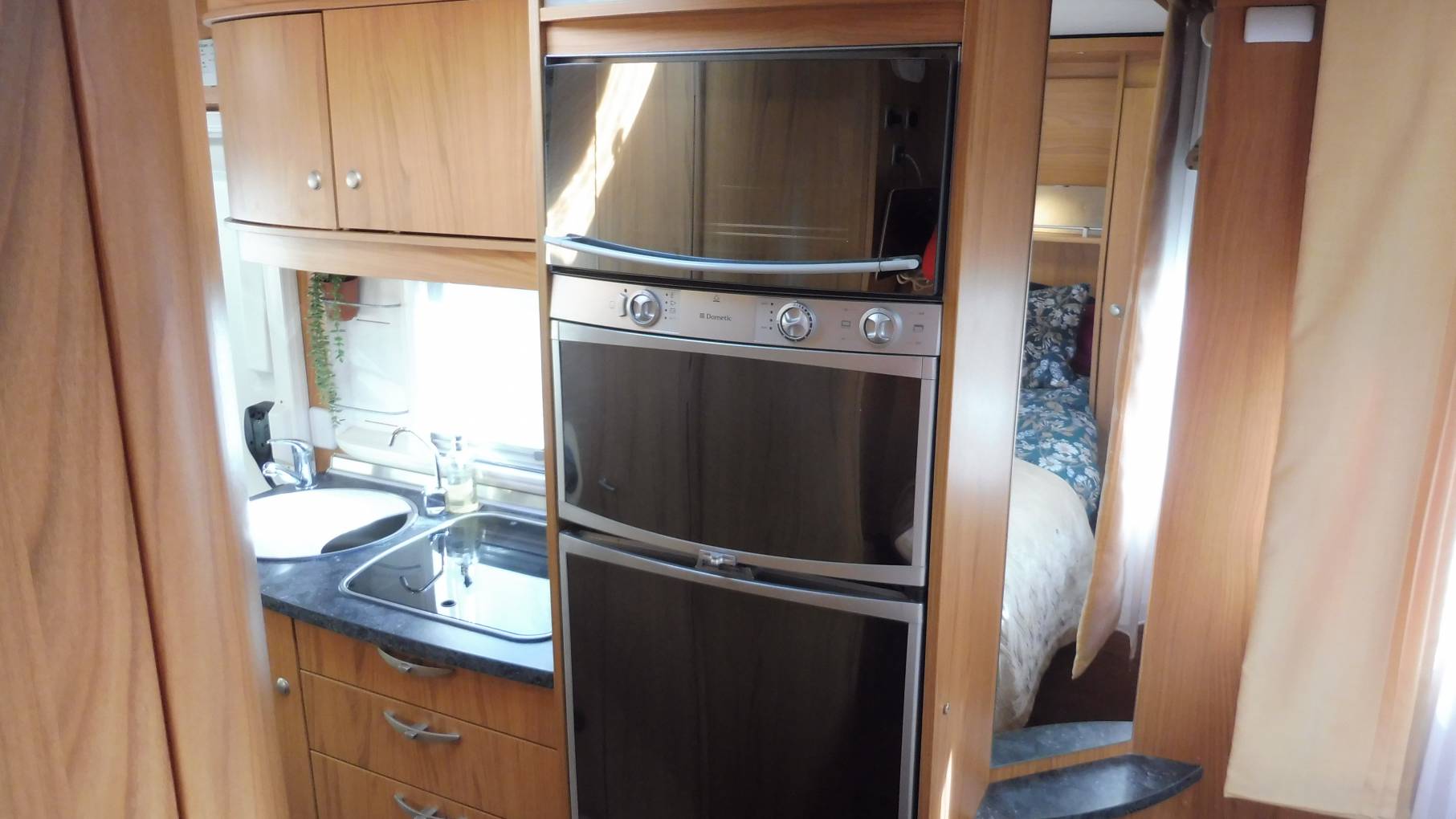 The kitchen is well specified with a stainless steel round sink with chrome mixer tap, a stainless steel hob with three gas burners, a Dometic 3-way powered tall fridge with separate freezer and a combination grill / oven unit above. There are upper and lower cupboards plus drawers to store away all of your holiday provisions. The washroom has a good-sized round shower tray with pull-round perspex shower door, a built-in wash basin plus a Thetford cassette swivelling toilet.