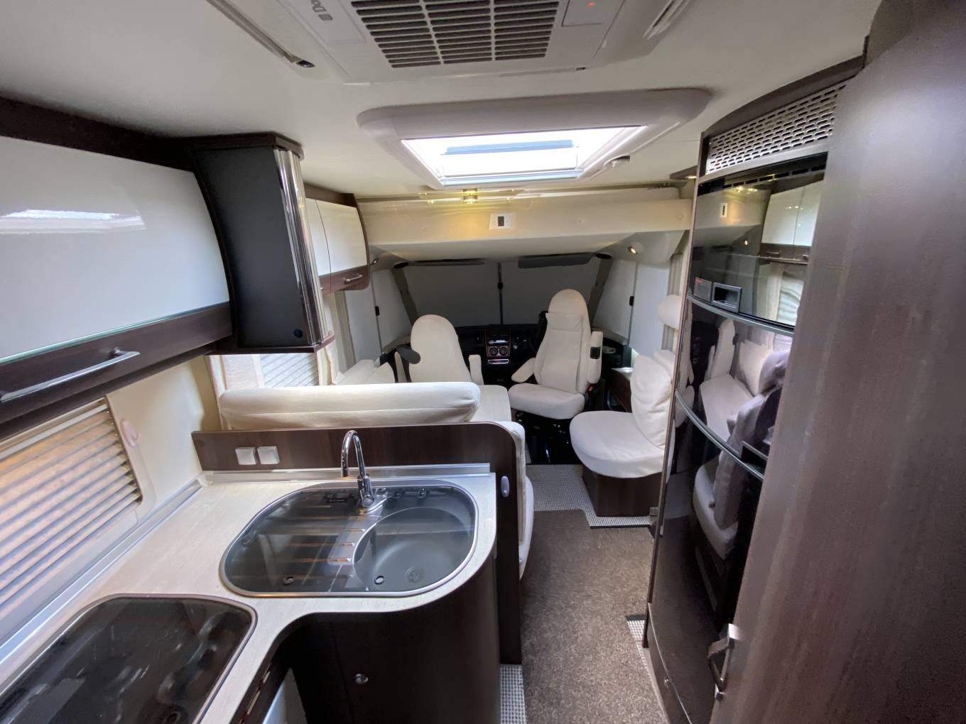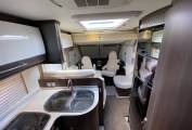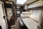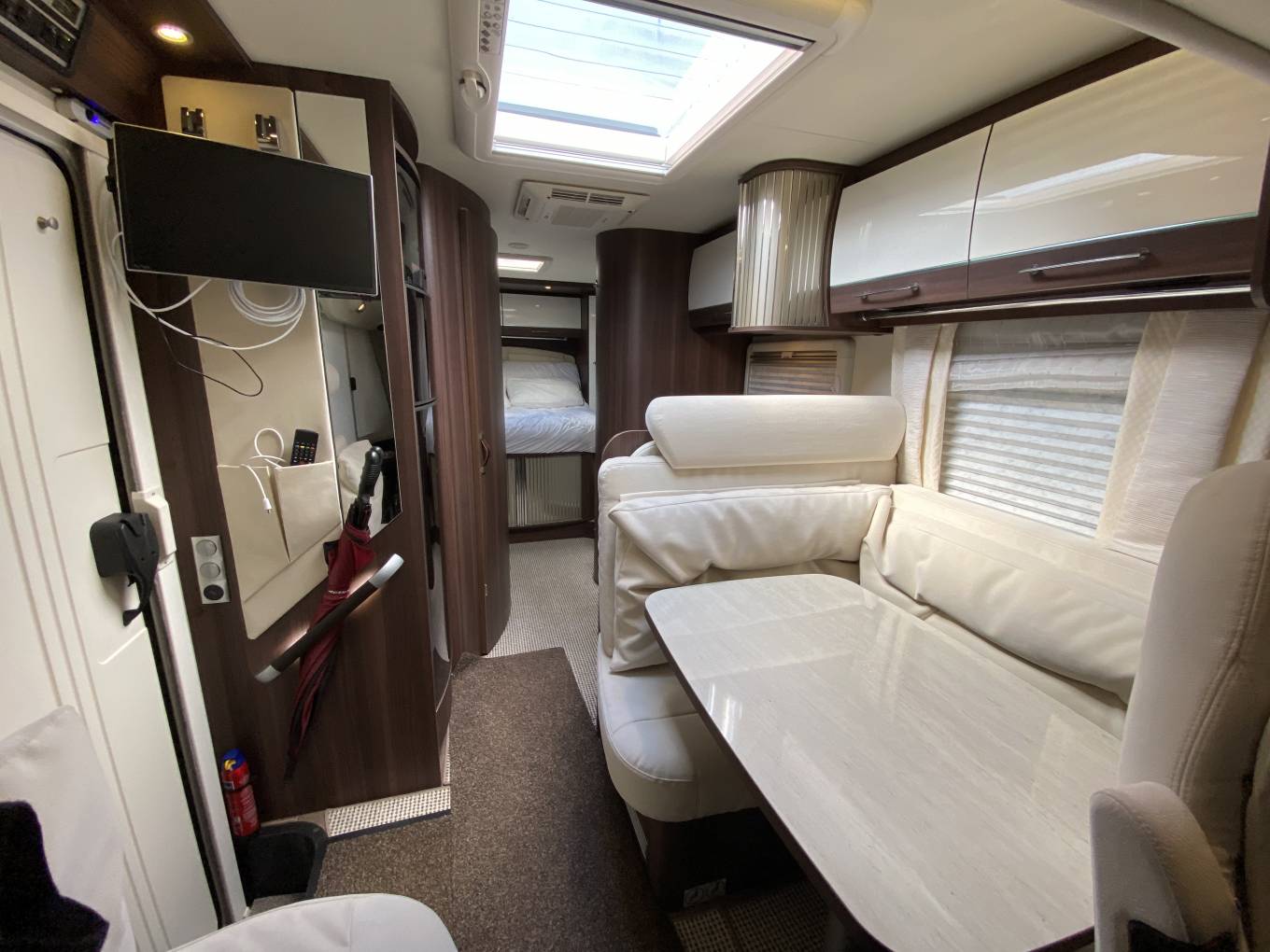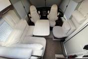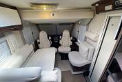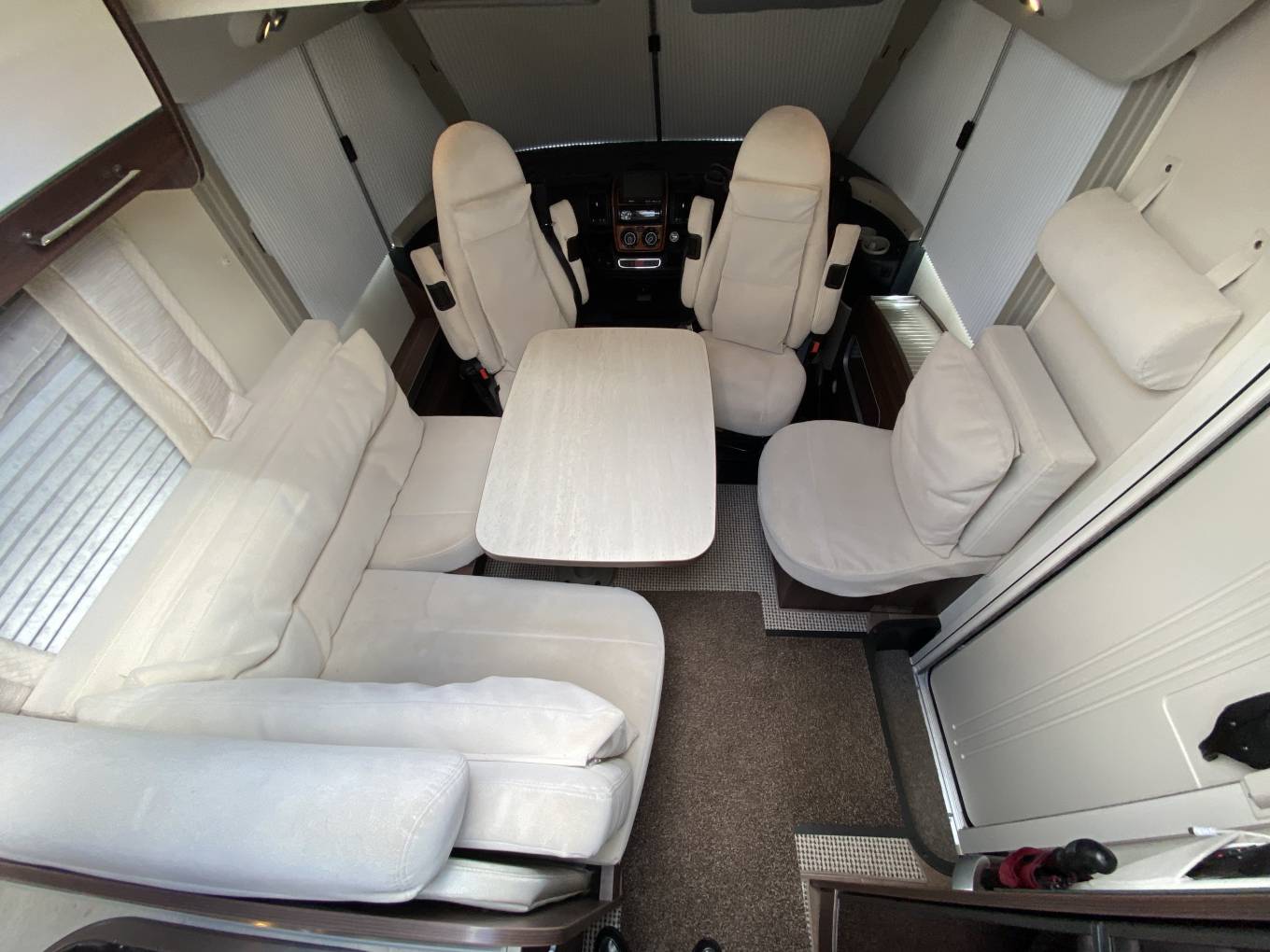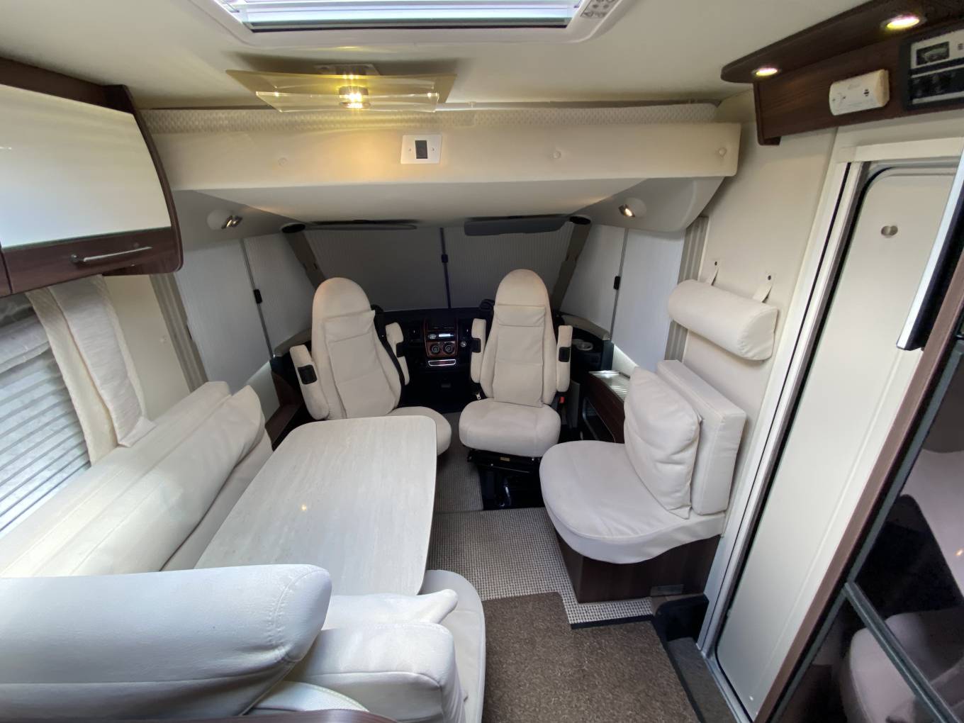 On entering via the electric step you come into the lounge area where you will find twin forward facing belted seats, a seat to the right of the door and a narrow one opposite. Combined with the swivelling driver’s and passenger Captains Chairs and a pedestal table moveable in all directions for dining this is a comfortable area.