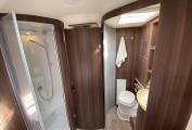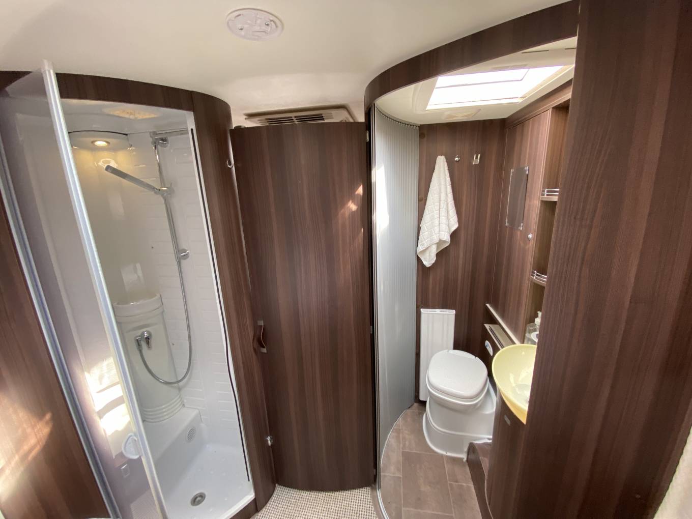 in one corner is the separate shower cubical and in the other corner the Thetford swivel bowl toilet and wash hand basin in its own room.