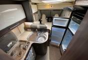 The kitchen straddles the centre of the motorhome consisting of a three burner gas hob, a three energy source Dometic Fridge and Freezer with an Oven above, a Microwave Oven and a sink with hot and cold water.