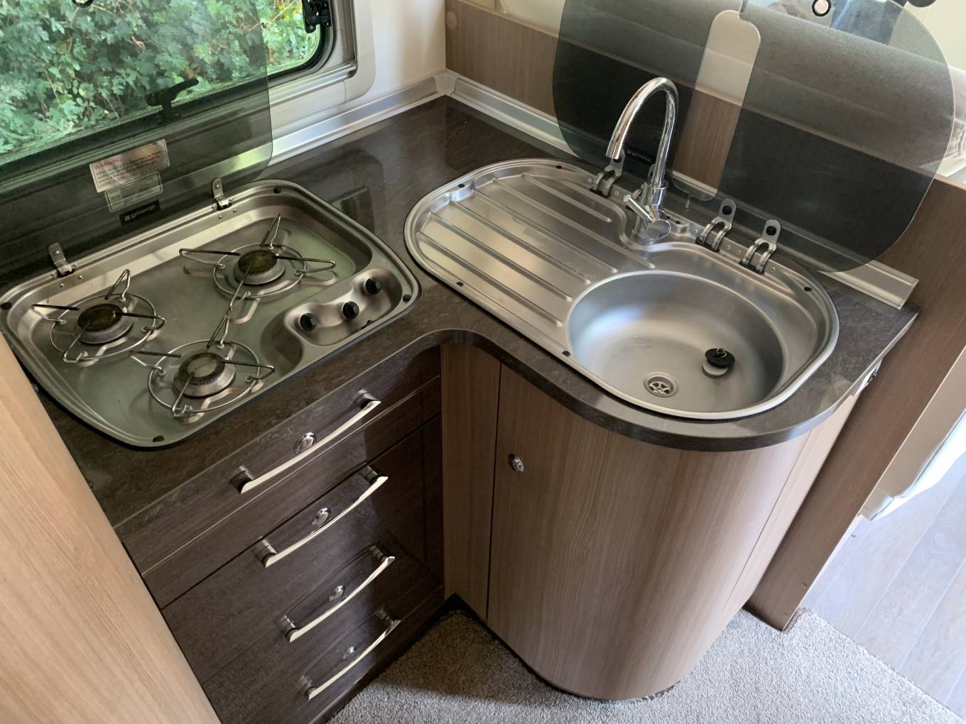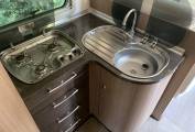 Infront of the bed you have the spacious washroom that gives you everything you need to refresh and recharge aswell as a separate shower cubicle. This bedding area and the toilet area can be closed off from the rest of the motorhome with ease and this is demonstrated in the photos and the video walkaround. Mid habitation you have the kitchen area that is next to the Habitation door which gives you extra ventilation when cooking a hearty meal for any occasion, the kitchen area comes with, 3 gas hobs, oven/grill combi, full length fridge freezer.