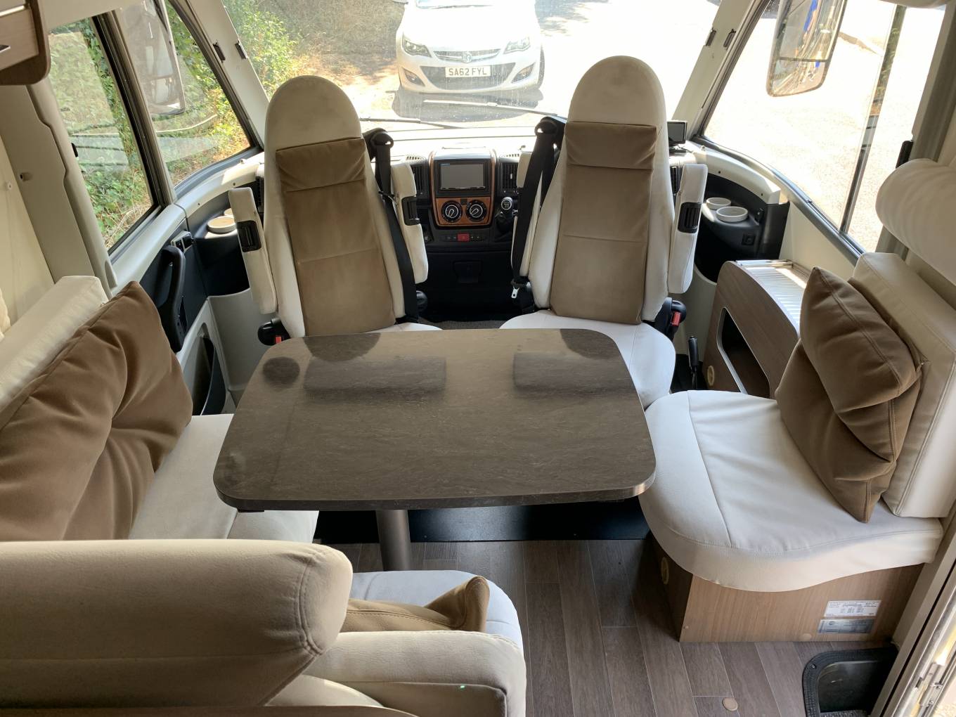 Behind the cab you have all the comfort you need with the luxury dinette area that offers you a fabulous place to relax and provides a lot of natural light. You have the L-Shaped sofa fitted with two seatbelts and a side facing seat. The table can be manoeured into various positions depending on how you choose to use it and how many people are dining or relaxing in the motorhome.