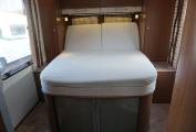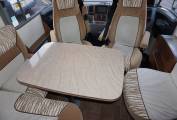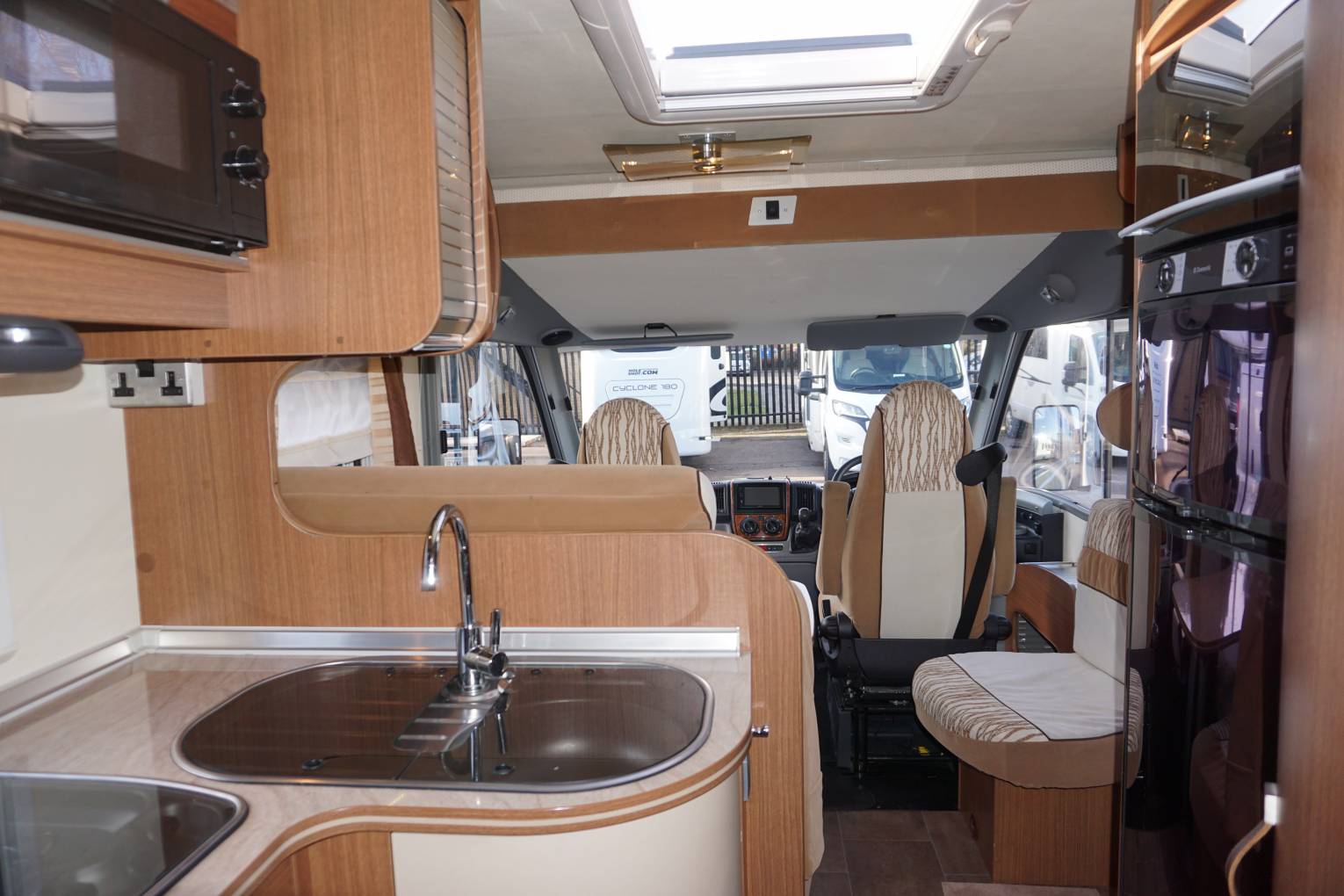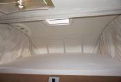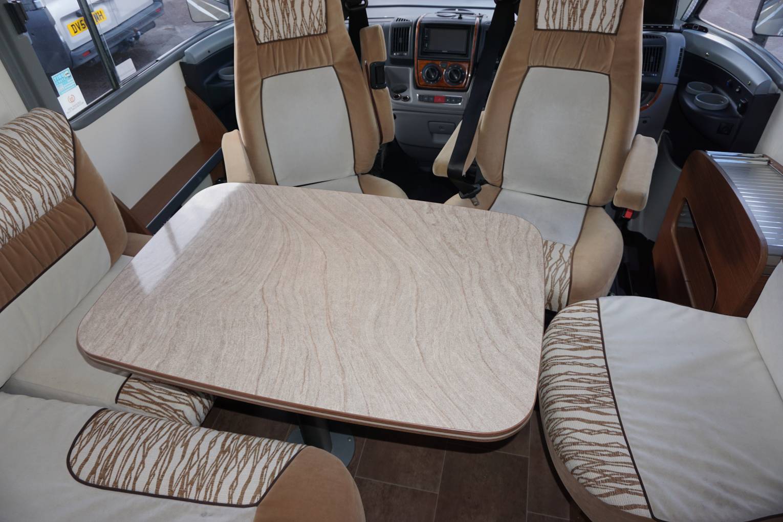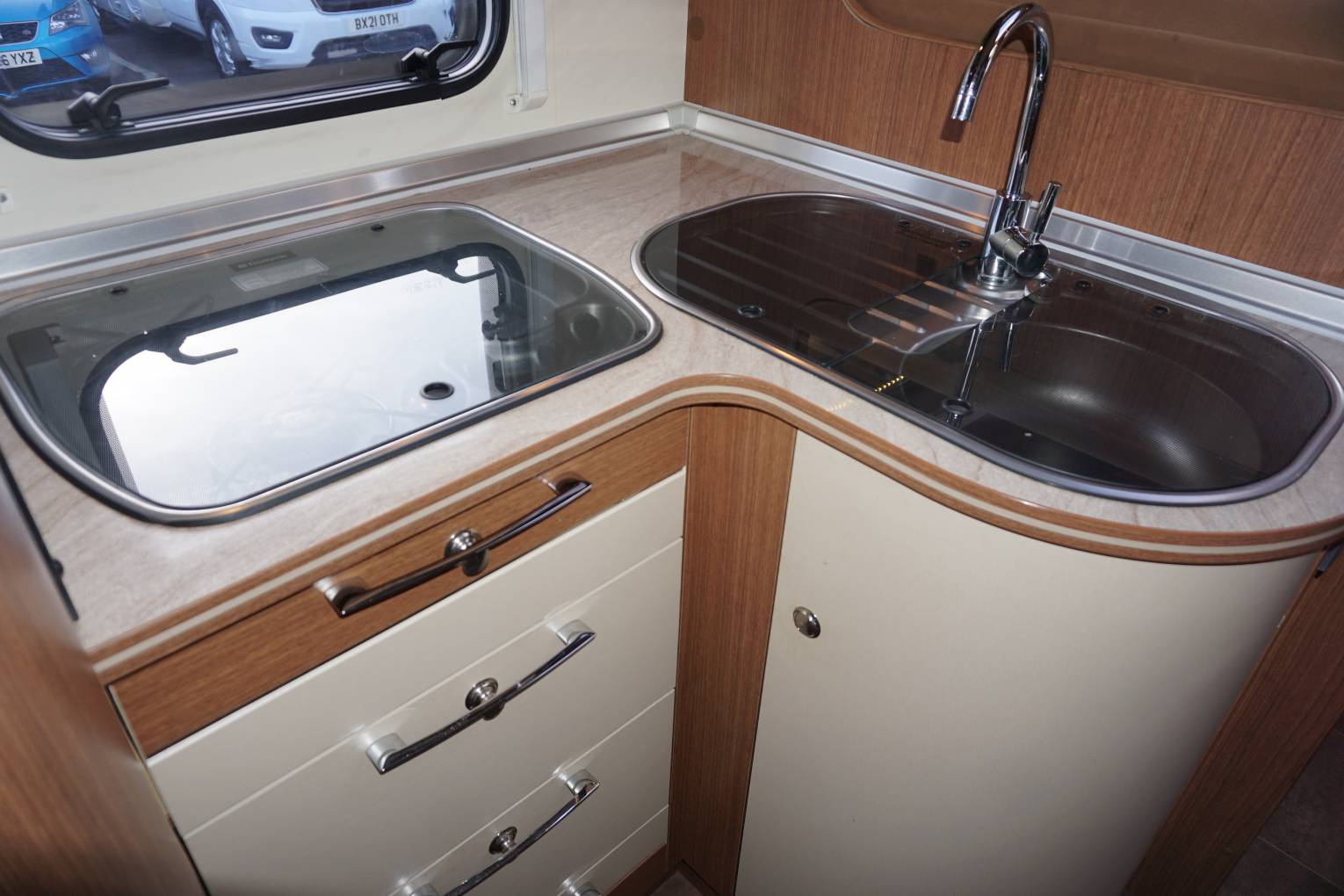 The kitchen is located to the centre of the motorhome and has a oven/grill combi, 3 ring gas hob, sink and large fridge/freezer. To the front of the van is a spacious lounge area with a dinette, 2 front swivel seats and a side-facing bench seat, in total this area can comfortably accommodate 6. Finally, tucked neatly away above the cab is a drop down bed, this lowers with ease and caters for the second 2 of 4 sleeping berths.