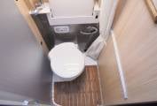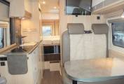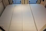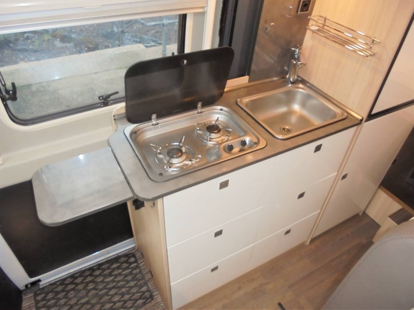 converts to a single bed, central kitchen and washroom areas, rear double bed with