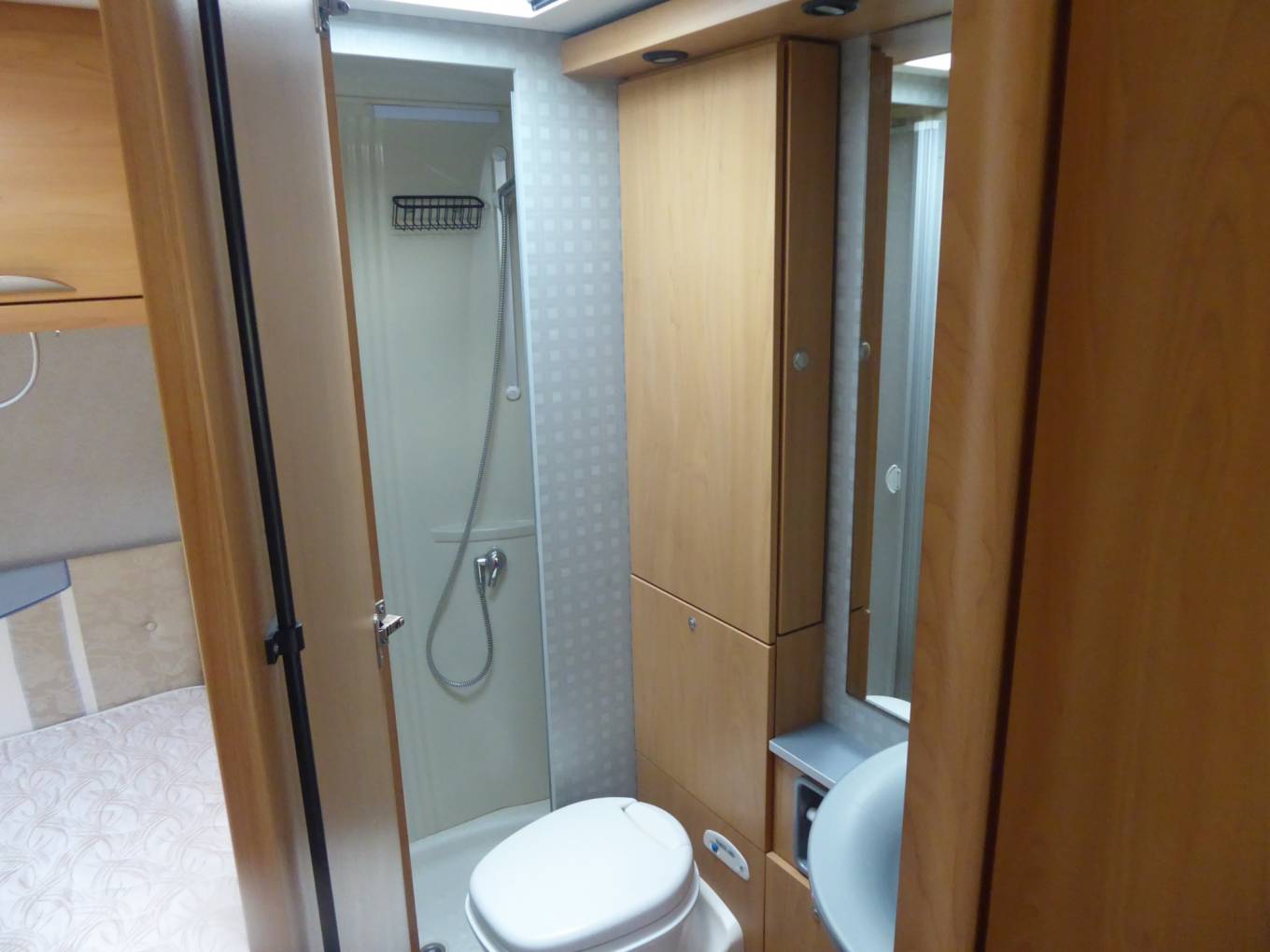 Conveniently adjacent to the French bed is the rear bathroom that features a toilet, a hand basin, and a separately screened shower.