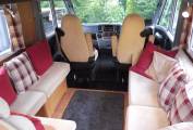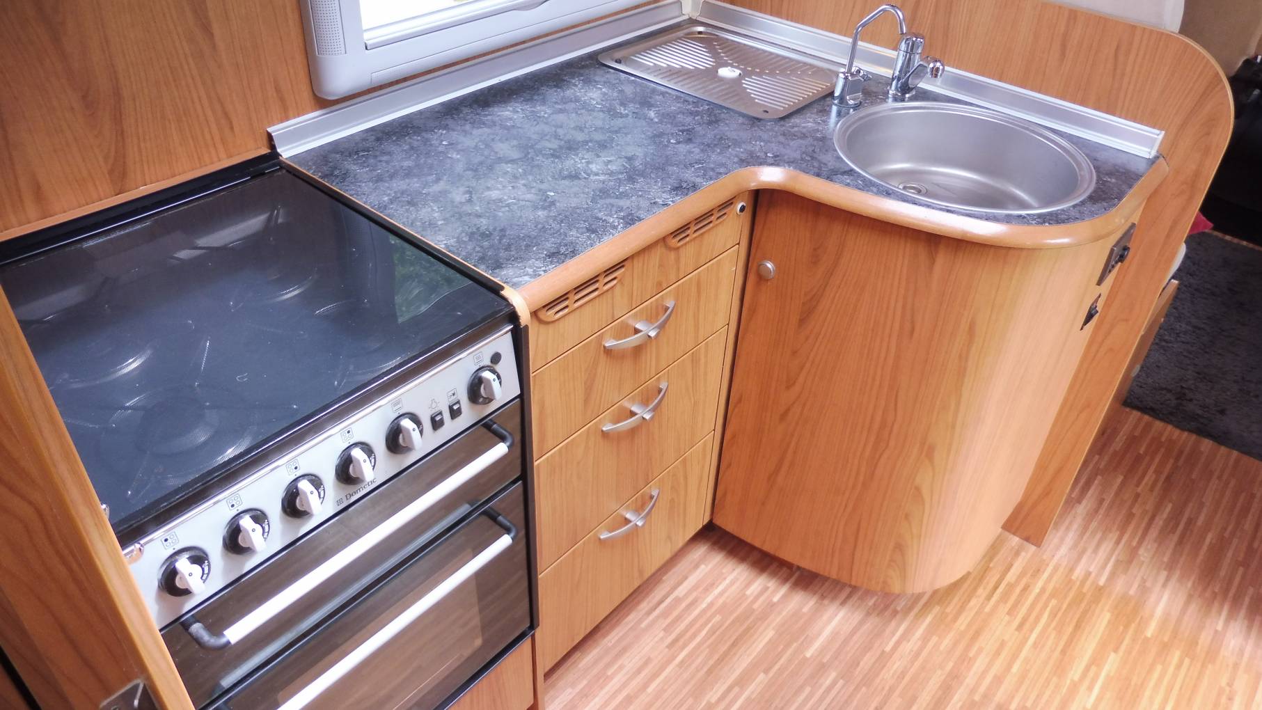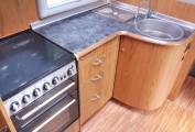 Moving rearwards there is a well-equipped kitchen with 4-burner hob, full oven with grill and large fridge with separate freezer box.