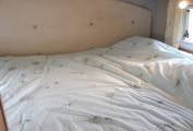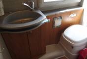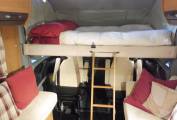 The rear of the motorhome, which can be partitioned off with a wooden door, houses a separate washroom and shower cubicle and leads to the double bed over the garage. Additional sleeping accommodation is in the large overcab drop-down bed and could be supplemented with an occasional single in the lounge.