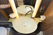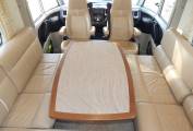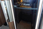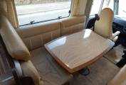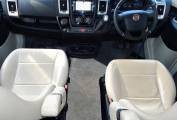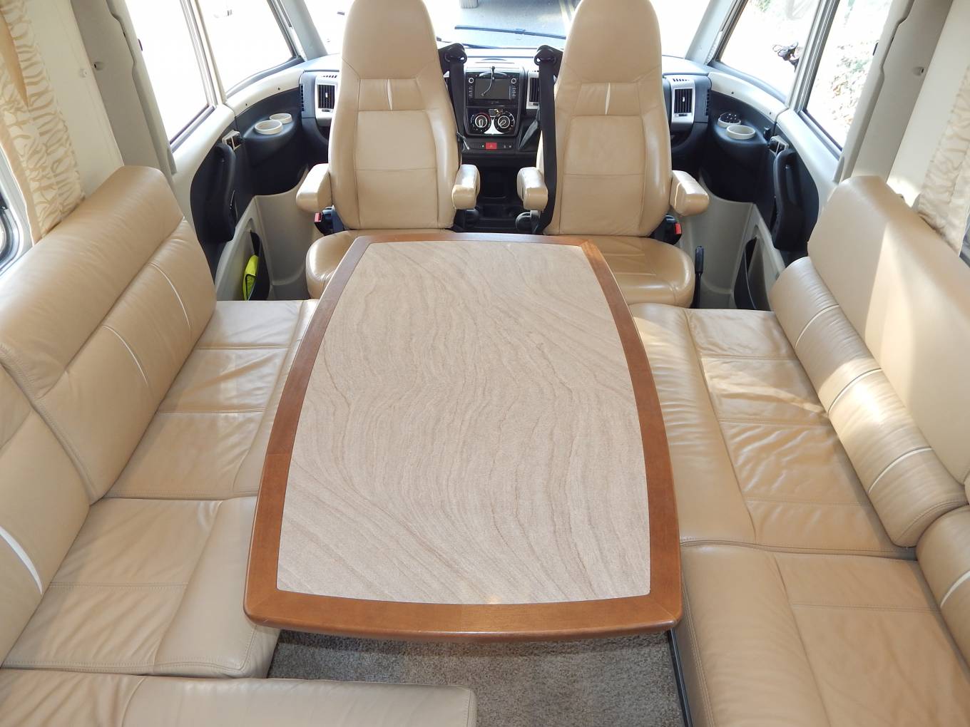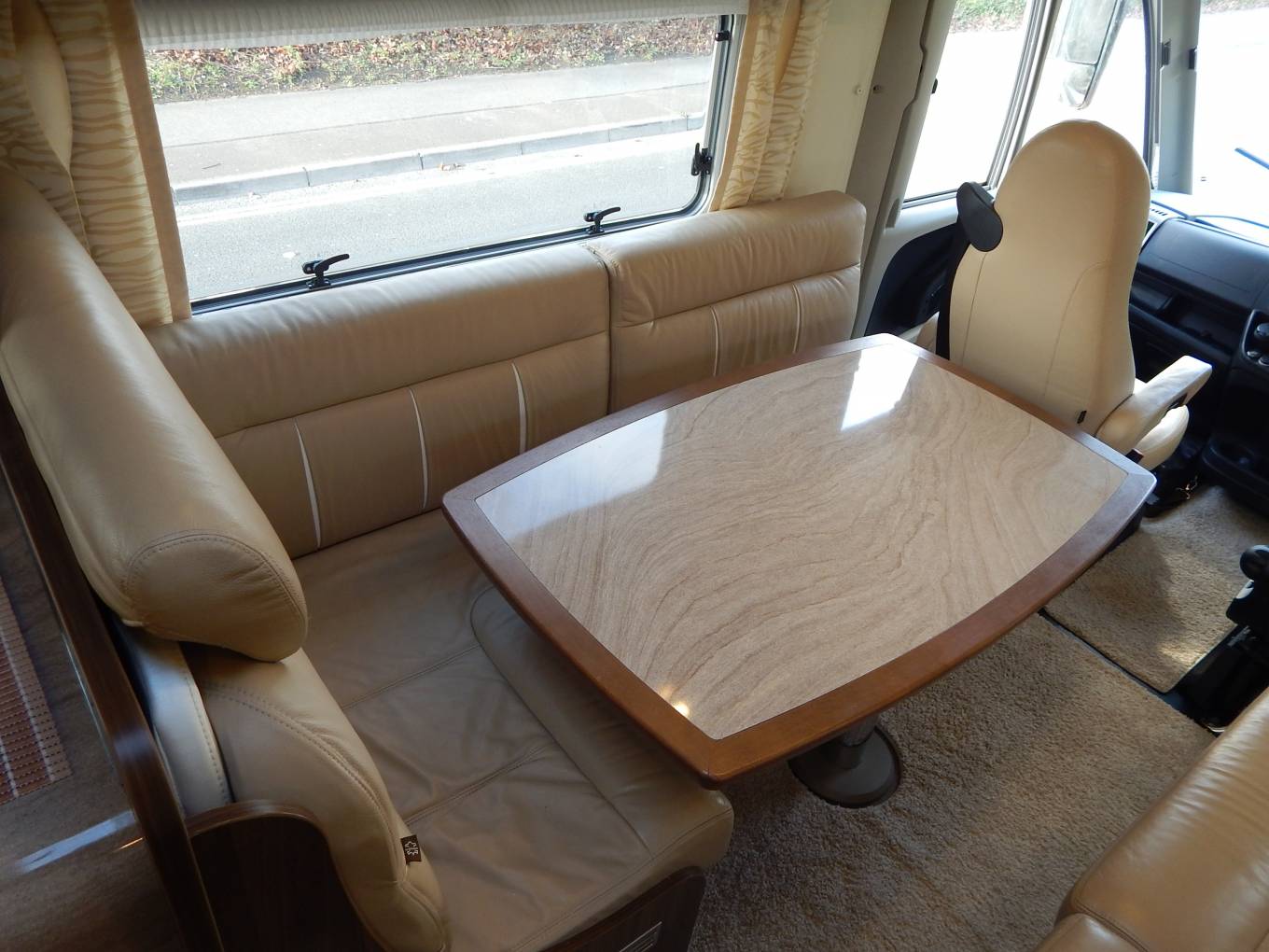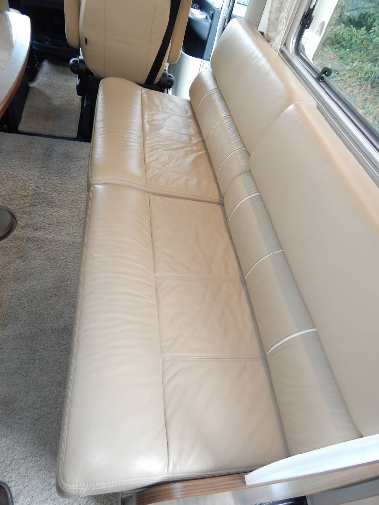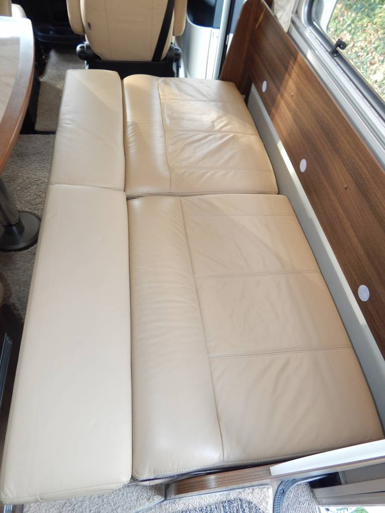 The vehicle is entered on the drivers side via an electric step through the habitation door, immediately to the right is the dinette which consists of an L shaped sofa, the forward facing part allowing for 2 travelling passengers in 2 x 3 point seat belts. Opposite is another large sofa, the drivers and passengers seats also swivel round to join this area. You could comfortably seat 8 people for dinner if entertaining. There is a 21" Avtex TV Point, access to a 700W Inverter that would charge laptops and power a freestanding Low Power Microwave. Above the Cab there is an electric double drop down bed the width of the cab.