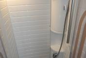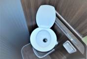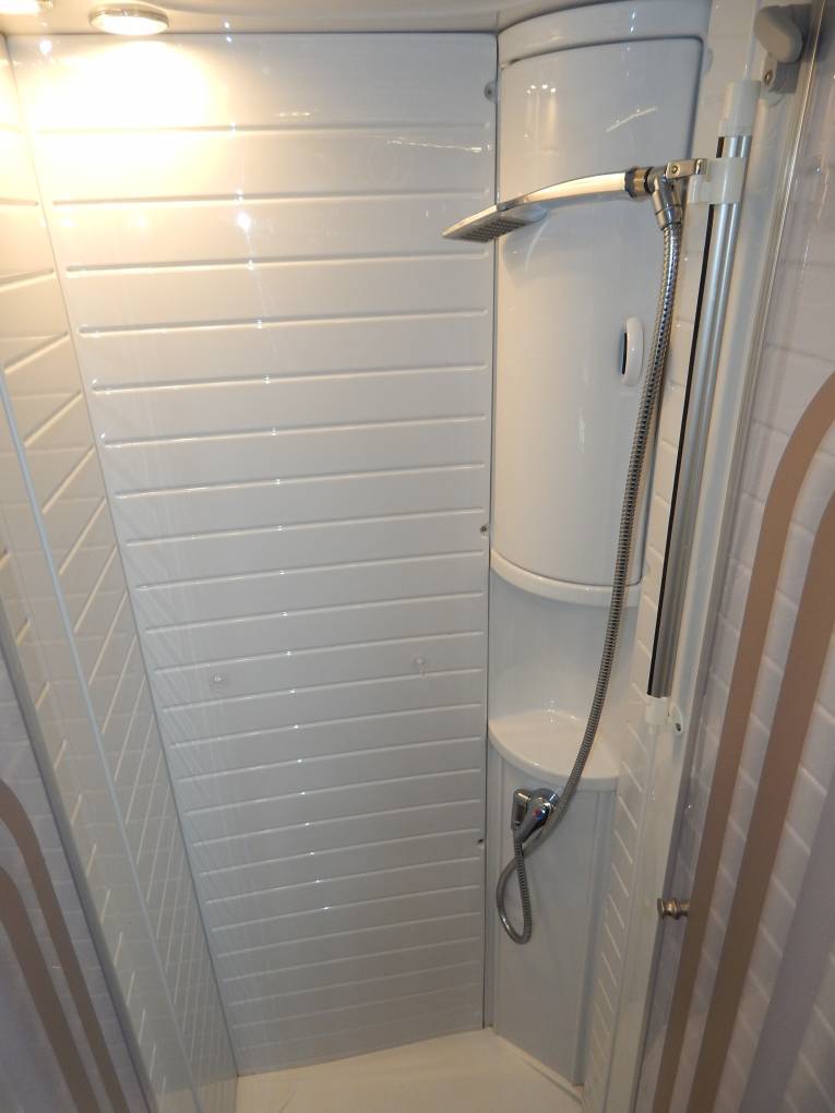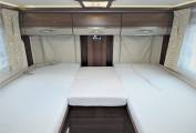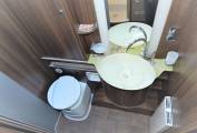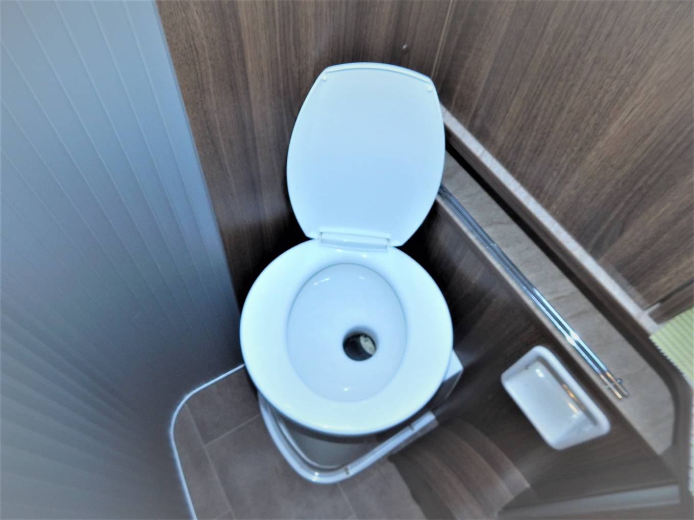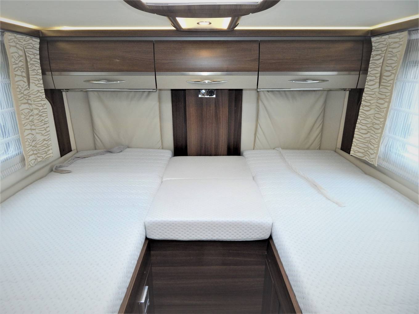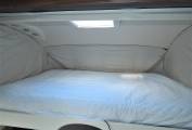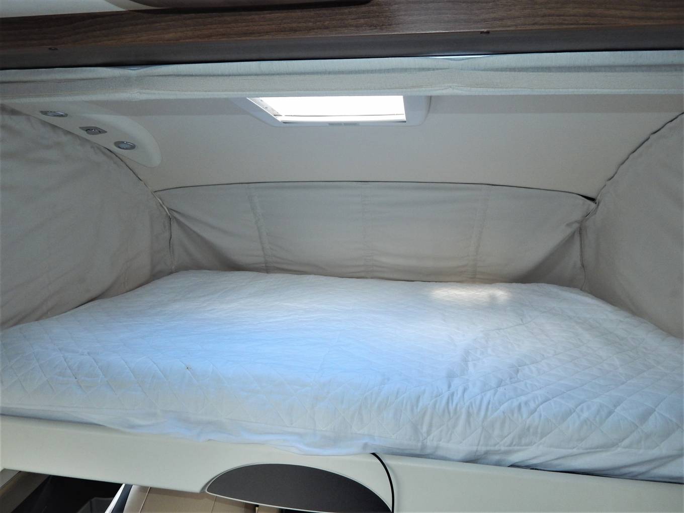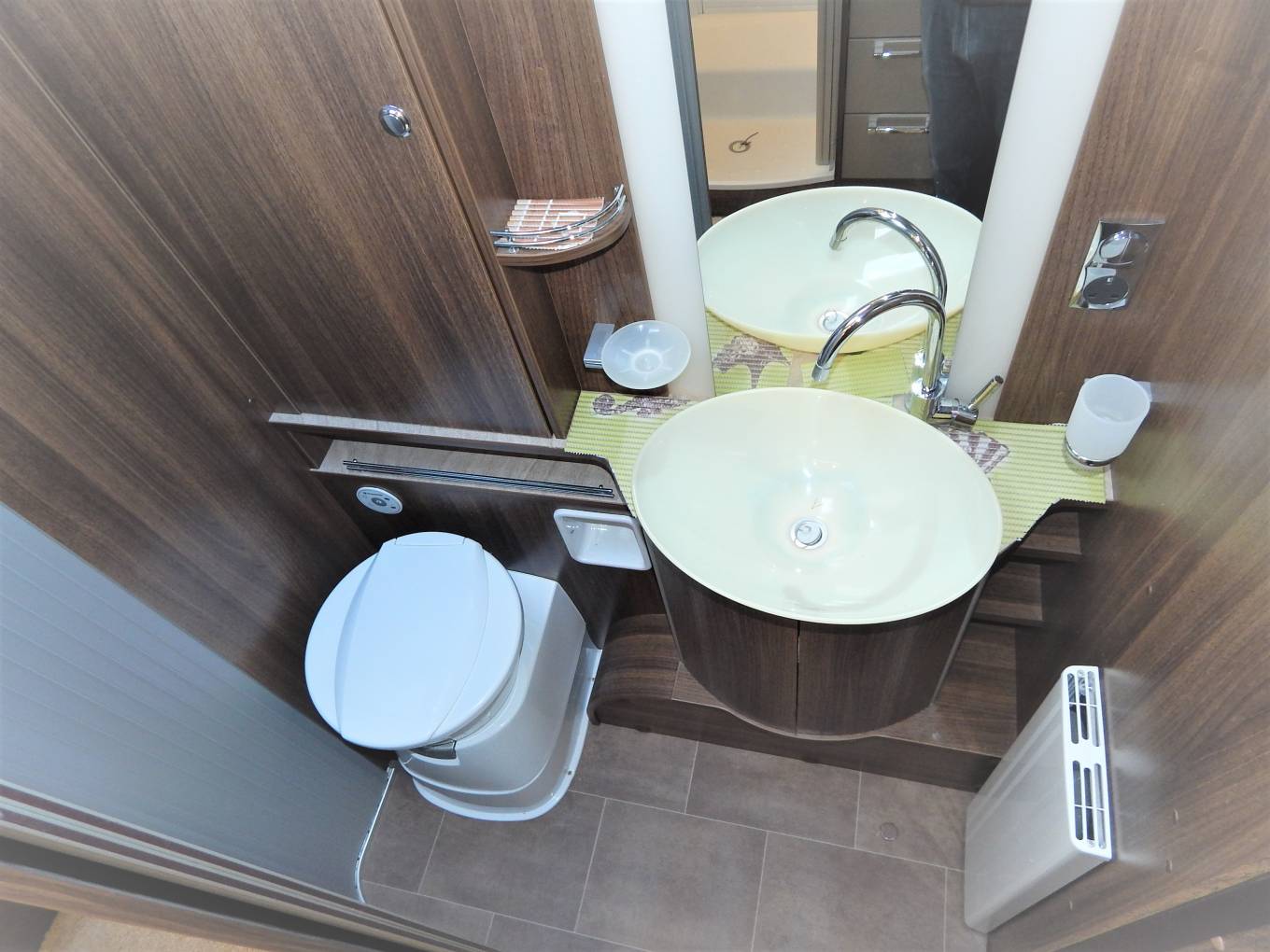 The Main bedroom area to the rear can be separated from the front with a solid closing door, there is a Dometic toilet with a swivel top, white sink with chrome mixer tap. On the opposite is a separate shower area with perspex doors. There is a hanging wardrobe and drawers underneath for storage. The twin single bed area is accessed via a fixed step and there are a couple of infill cushions at the head end. There is a TV Point at the foot of the bed that is wired to the Sat system.