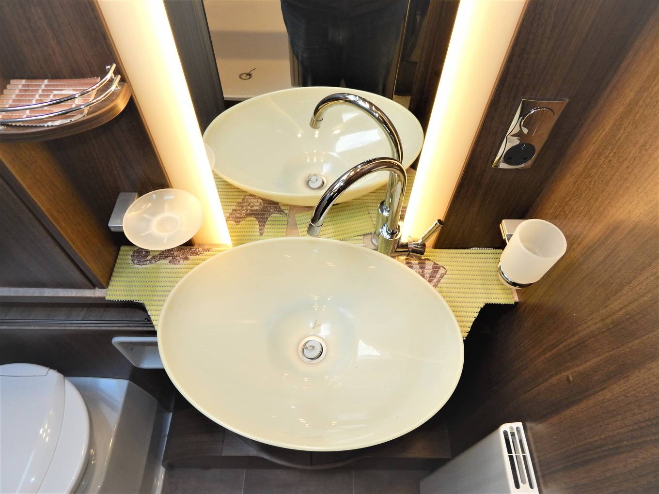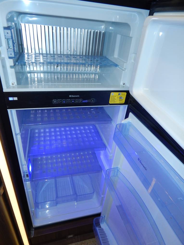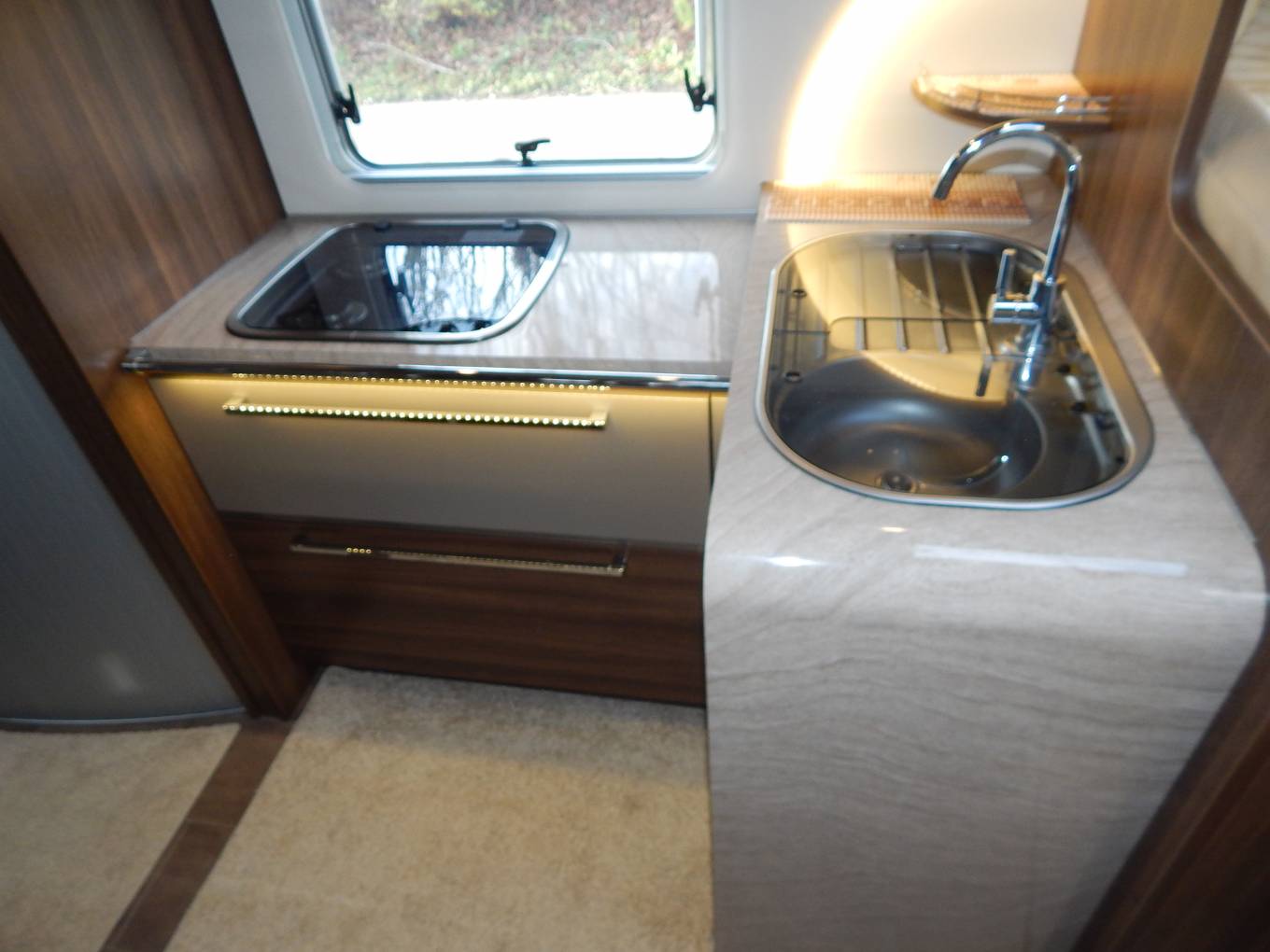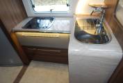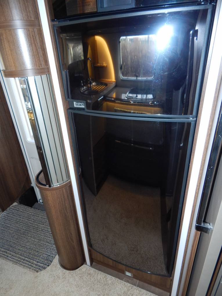 The Kitchen is L-Shaped with a brushed metal finish single sink & drainer including chrome mixer tap. A black enamel finish Hob has 3 Gas burners with a extractor hood above. Beneath there is plenty of storage space in two large soft close drawers. Opposite is a Tec Tower, Oven above a Dometic Fridge with separate Freezer which can automatically be powered by 240v, 12v or gas depending on whether you are plugged in on site or wild camping.