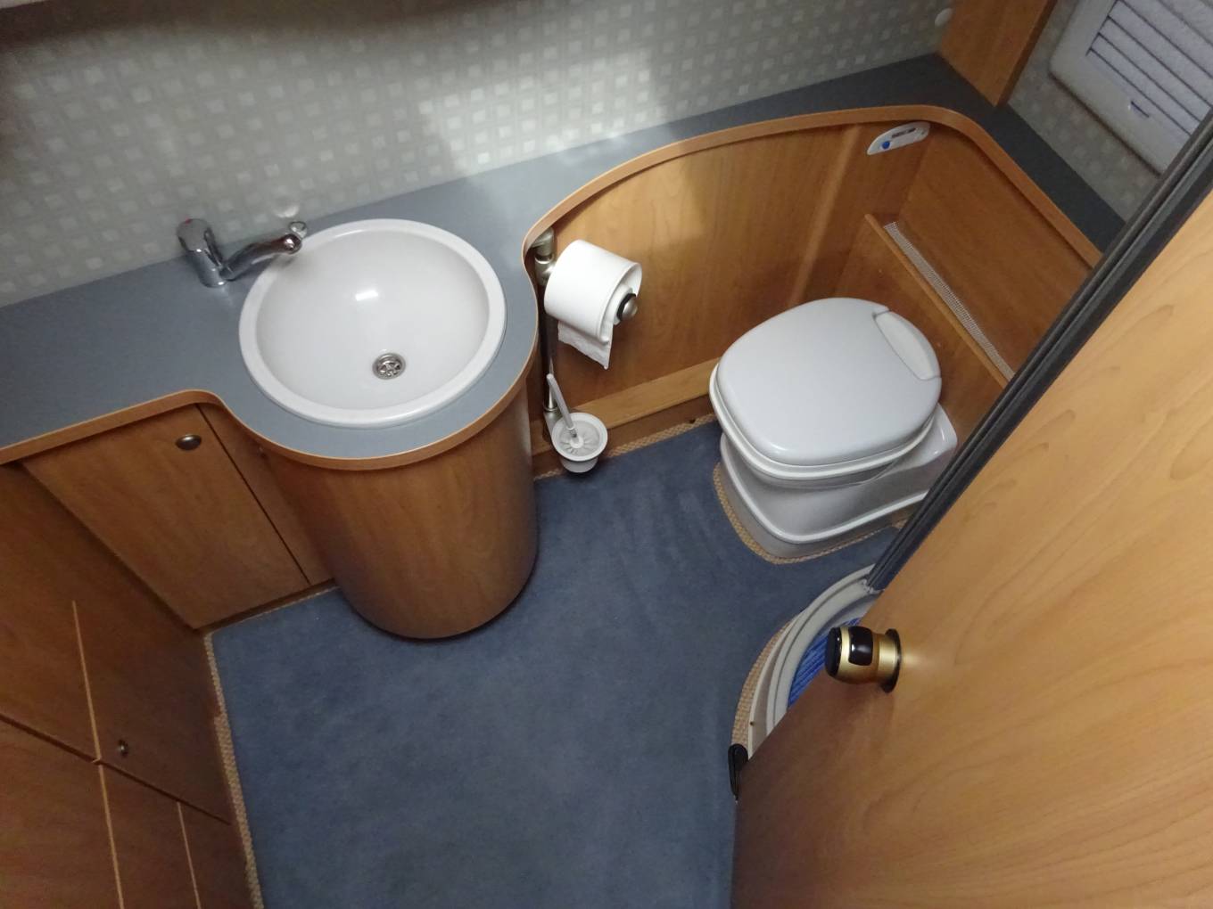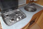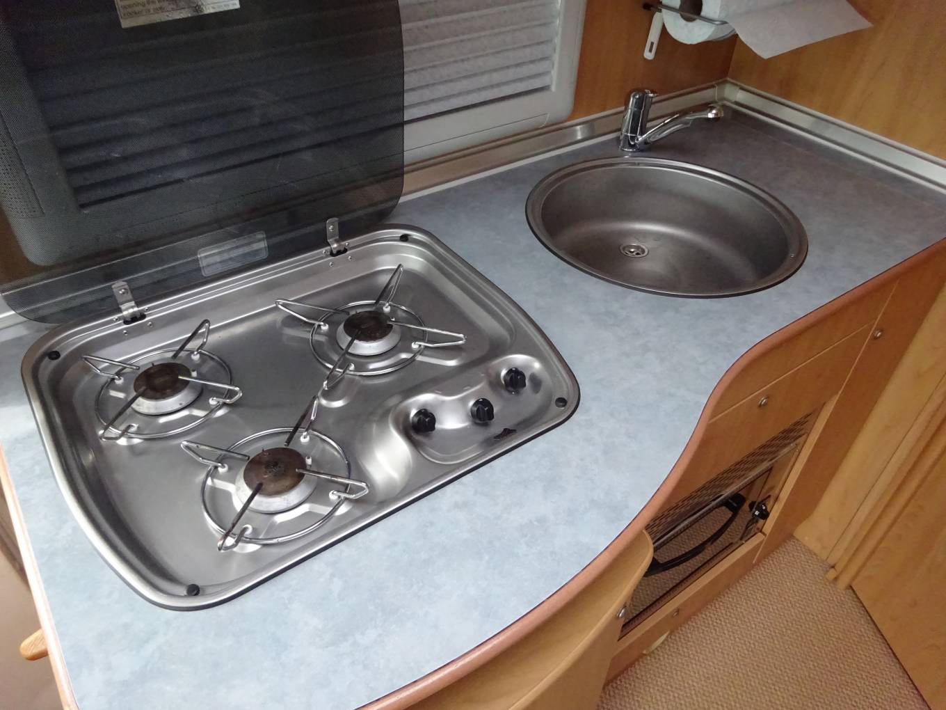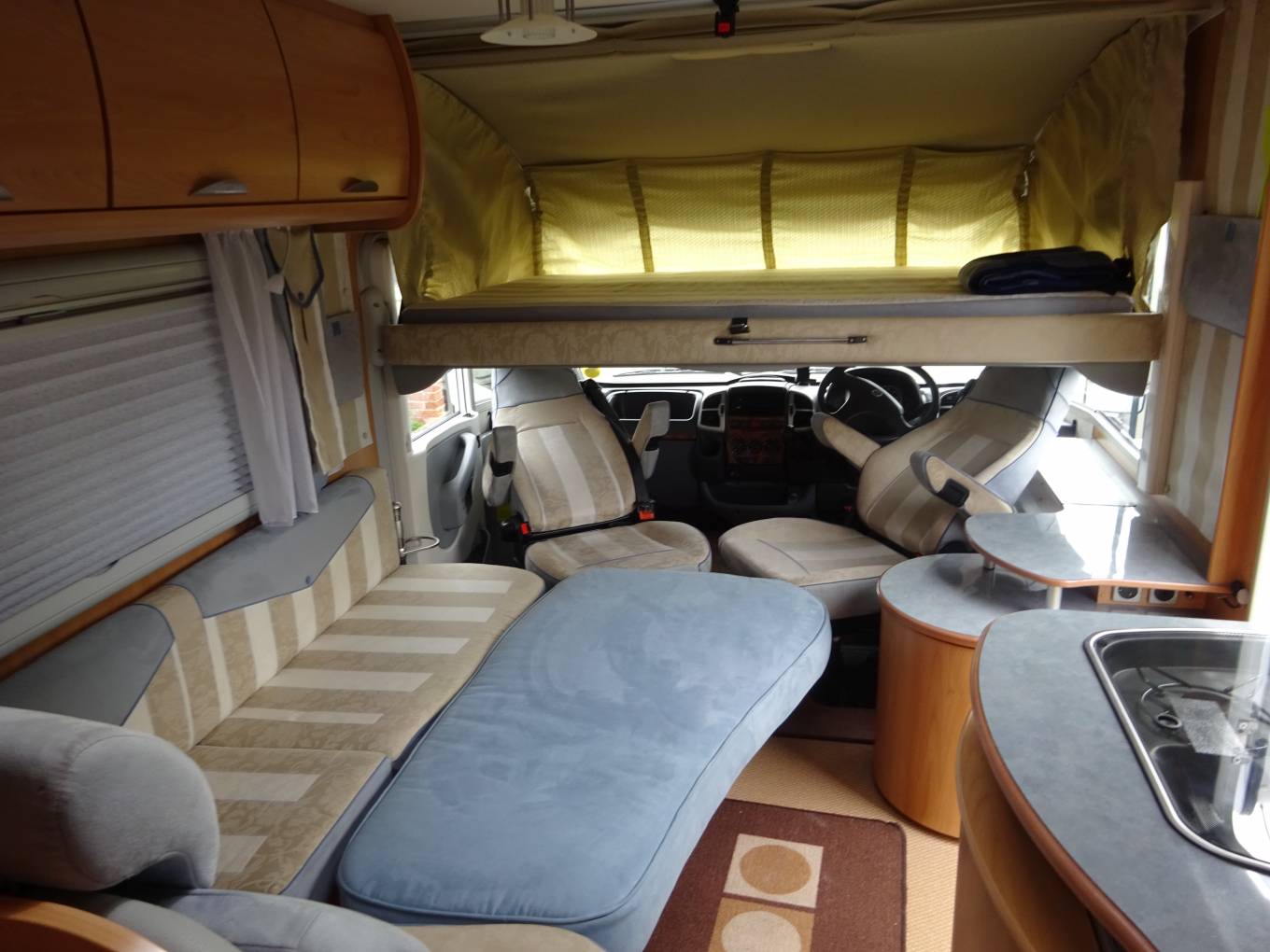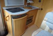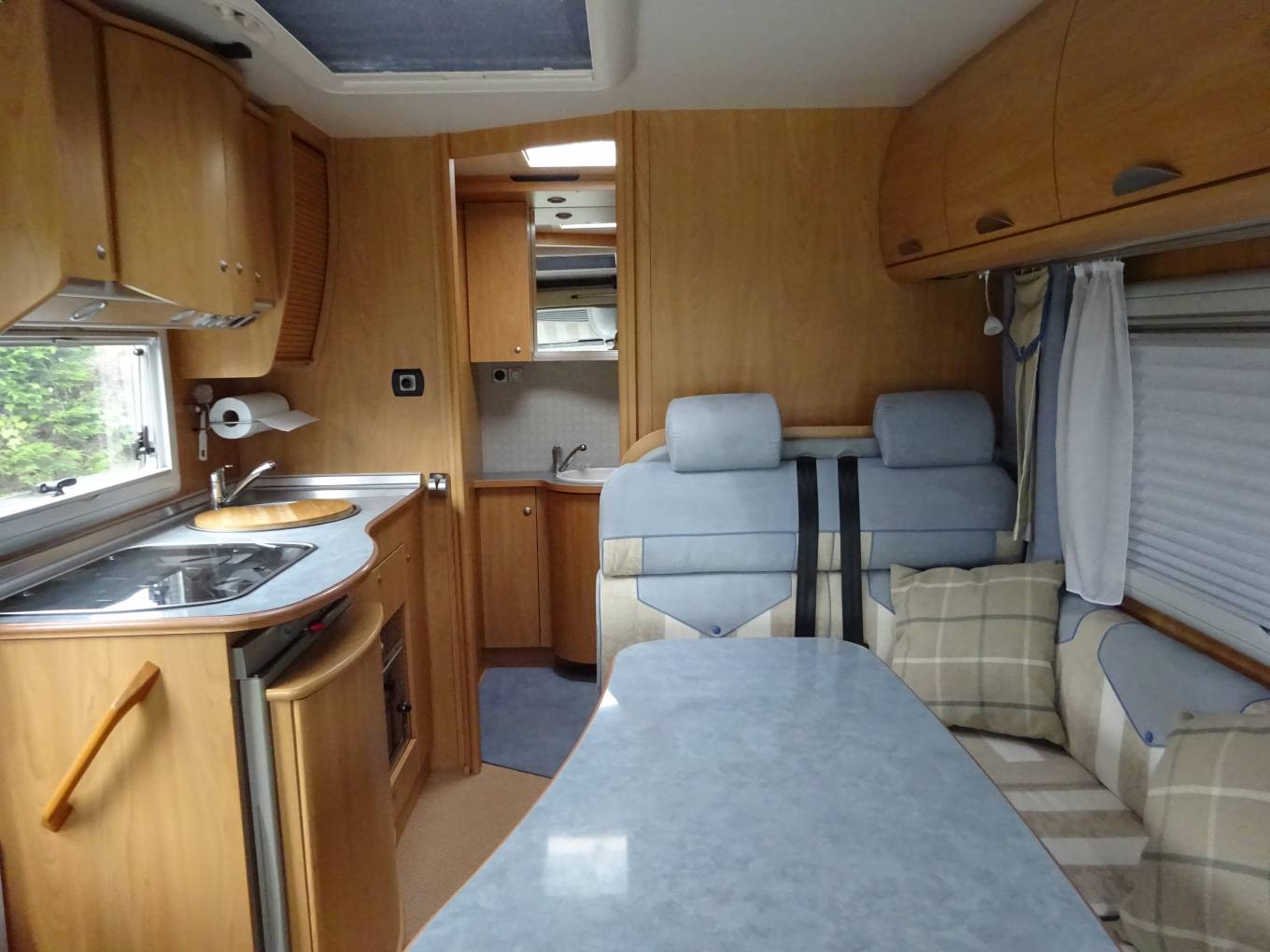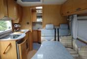 Inside we have a large lounge area that can easily seat 6 with a dinette table that slides both left to right and front to back to allow easy access around it. This lowers down easily to form a double bed with another drop down double bed above the cab area. Above the lounge area are 4 large overhead storage lockers. The kitchen area is well laid out with a spacious fridge, 3 ring gas burner hob, an oven and grill, and again plenty of storage areas. This brings us to the large rear bathroom, with toilet, sink and a large separate shower cubicle designed for ease of use. In the bathroom is a good sized wardrobe and plenty of other draws and cabinets allowing for all your needs. This truly is a well laid out well equiped motorhome, designed to be under 6m/ 20 foot in length while still being spacious on the inside.