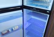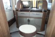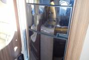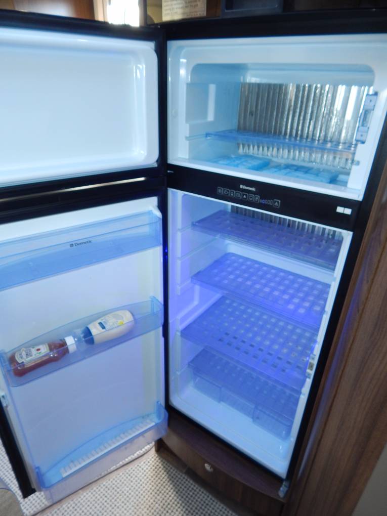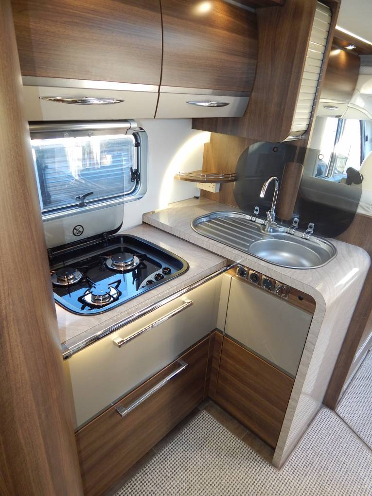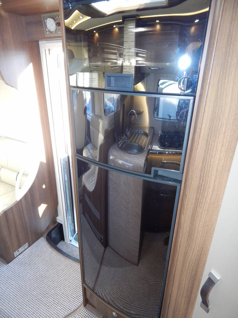 The Kitchen is L-Shaped with a brushed metal finish single sink & drainer including chrome mixer tap. A black enamel finish Hob has 3 Gas burners with a extractor hood above. Beneath there is plenty of storage space in two large soft close drawers. Opposite is a Tec Tower, Oven above a Dometic Fridge with separate Freezer which can automatically be powered by 240v, 12v or gas depending on whether you are plugged in on site or wild camping.