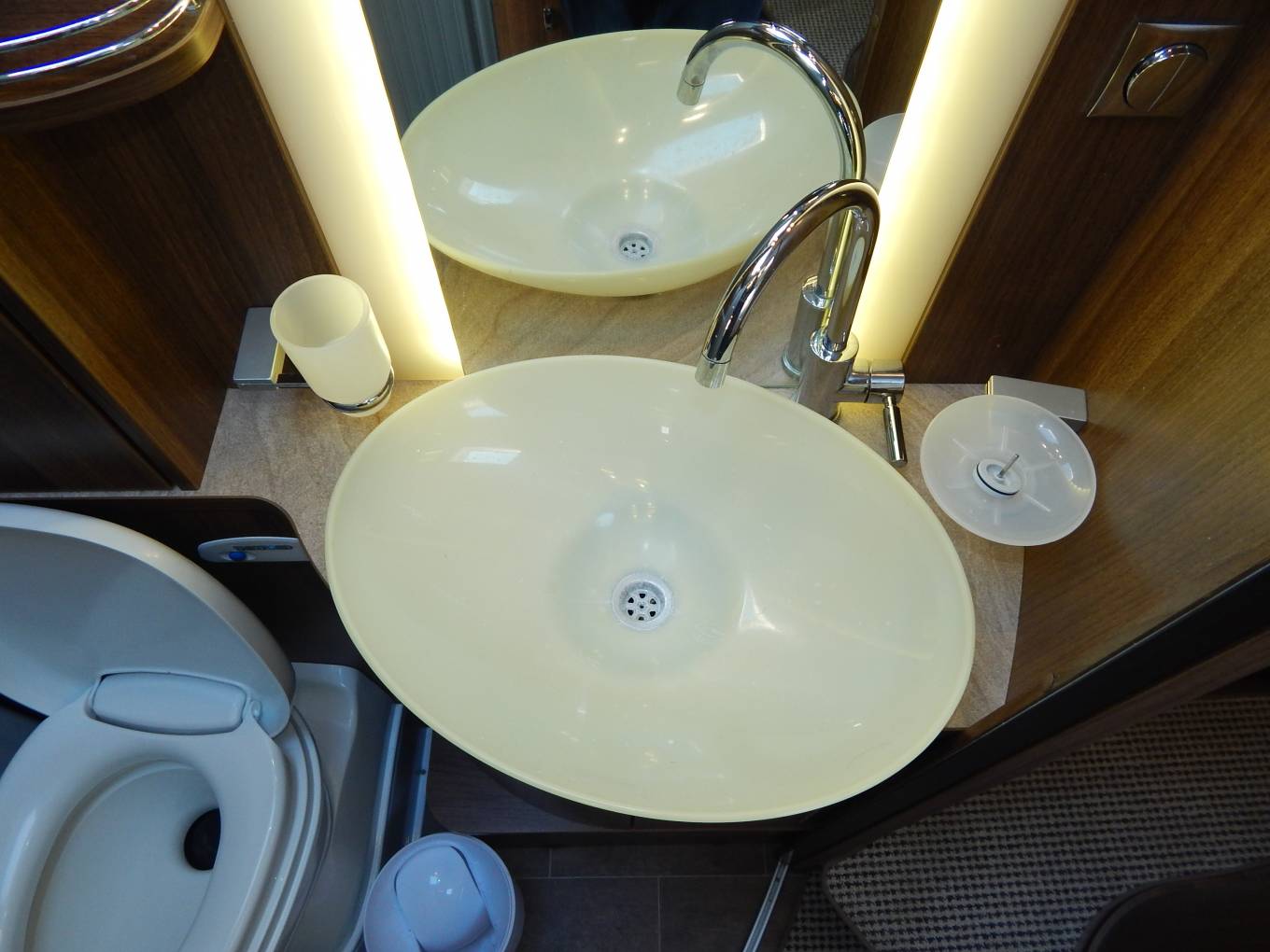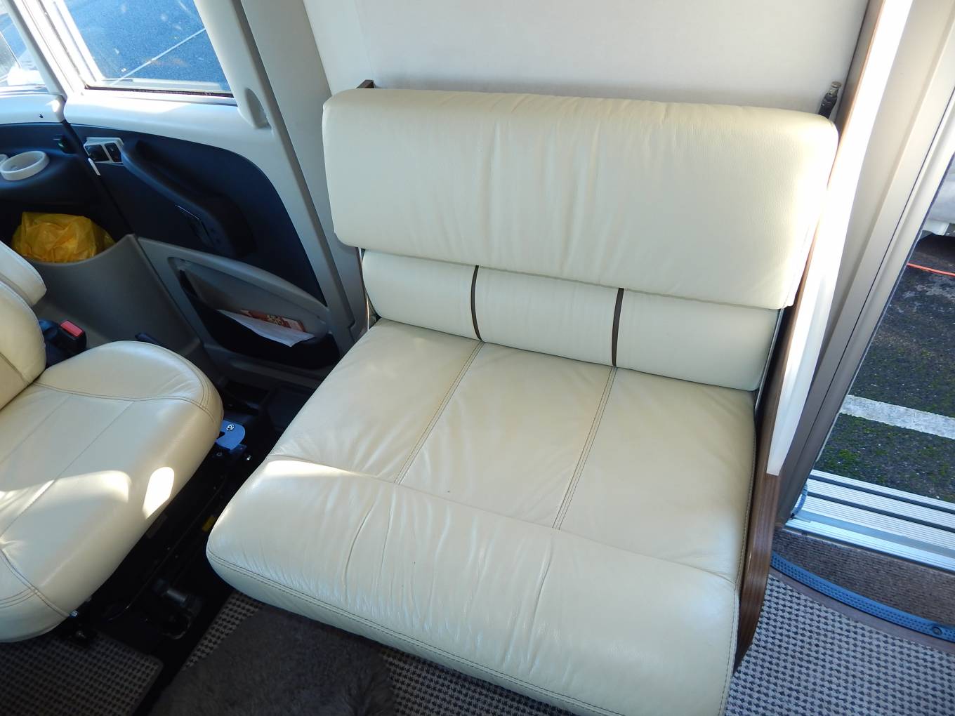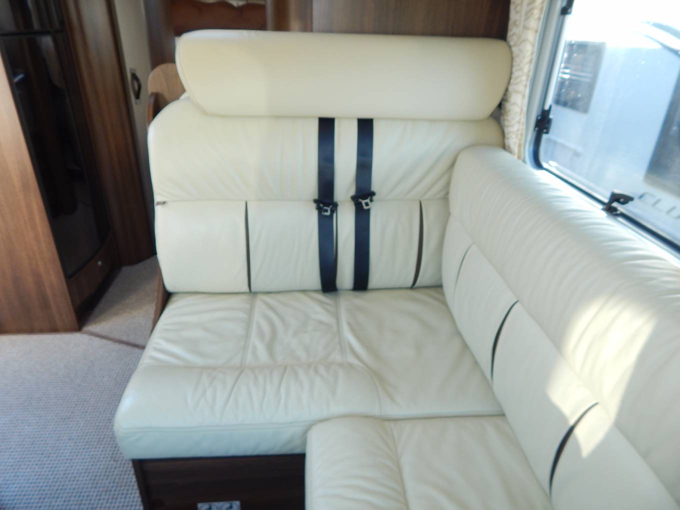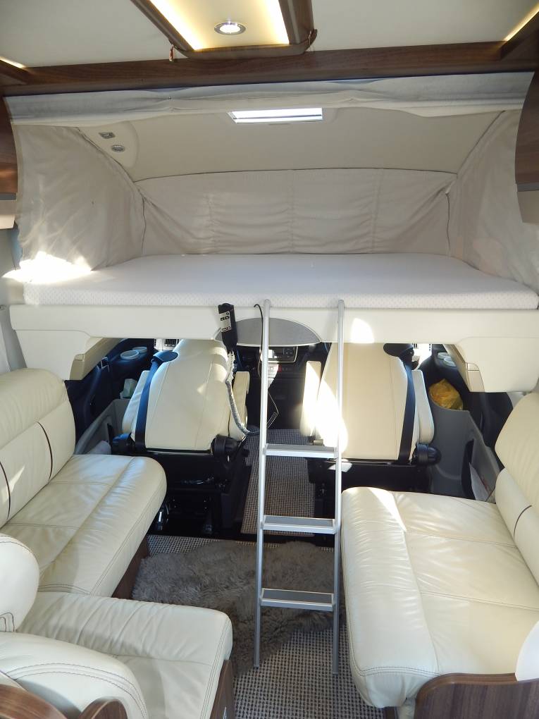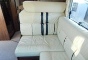 The vehicle is entered on the drivers side via an electric step through the habitation door, immediately to the right is the dinette which consists of an L shaped sofa, the forward facing part allowing for 2 travelling passengers in 2 x 3 point seat belts. Opposite is a smaller sofa, the drivers and passengers seats also swivel round to join this area, currently the table has been removed for comfort but is included in the sale. You could comfortably seat 6 people for dinner if entertaining. There is a TV Point in one of the overhead cupboards with an Avtex TV it has the benefit of a Maxview 85cm Satellite Dish and also a Digibox for Digital channels. Above the Cab there is an electric double drop down bed the width of the cab.