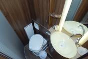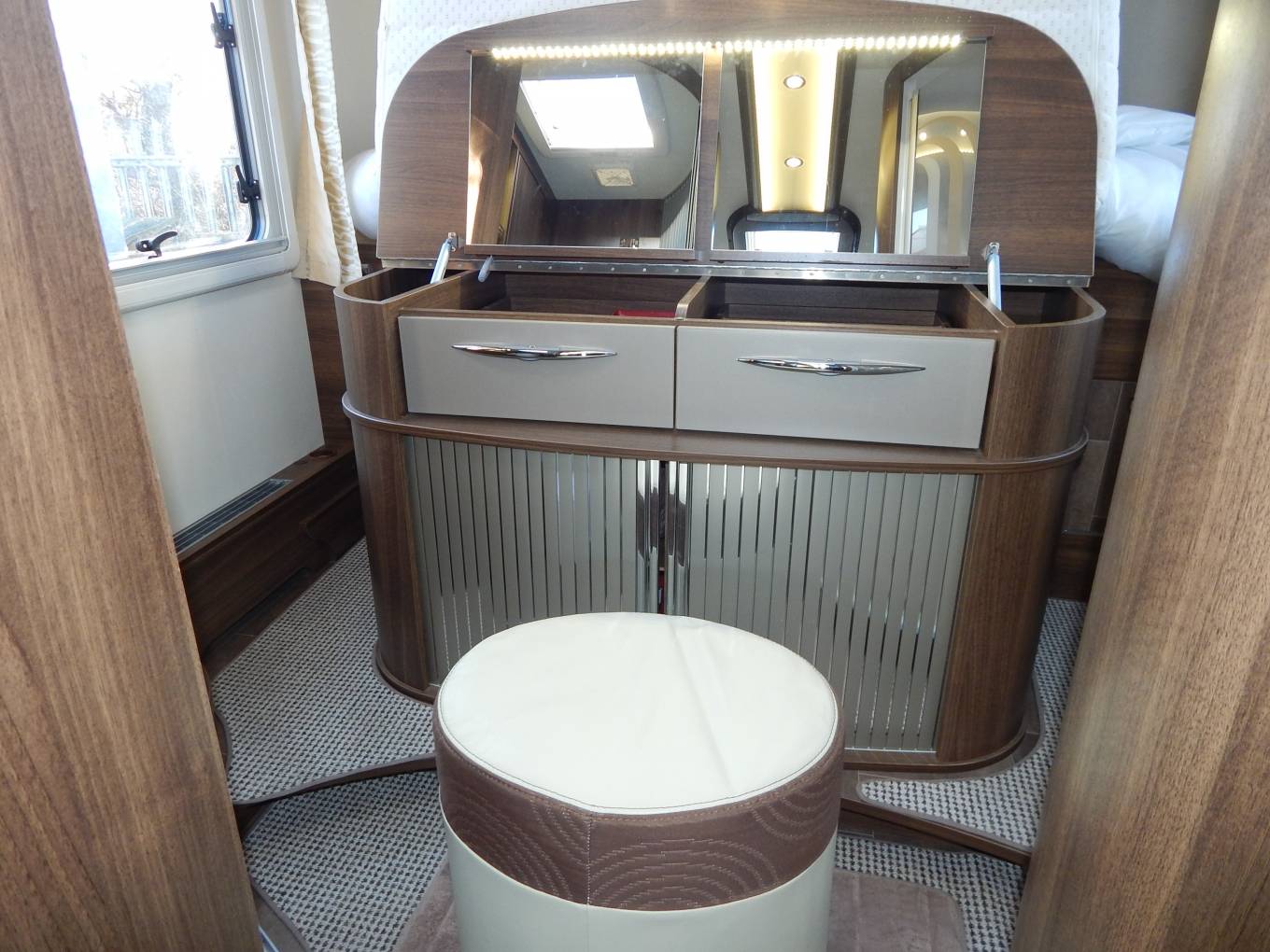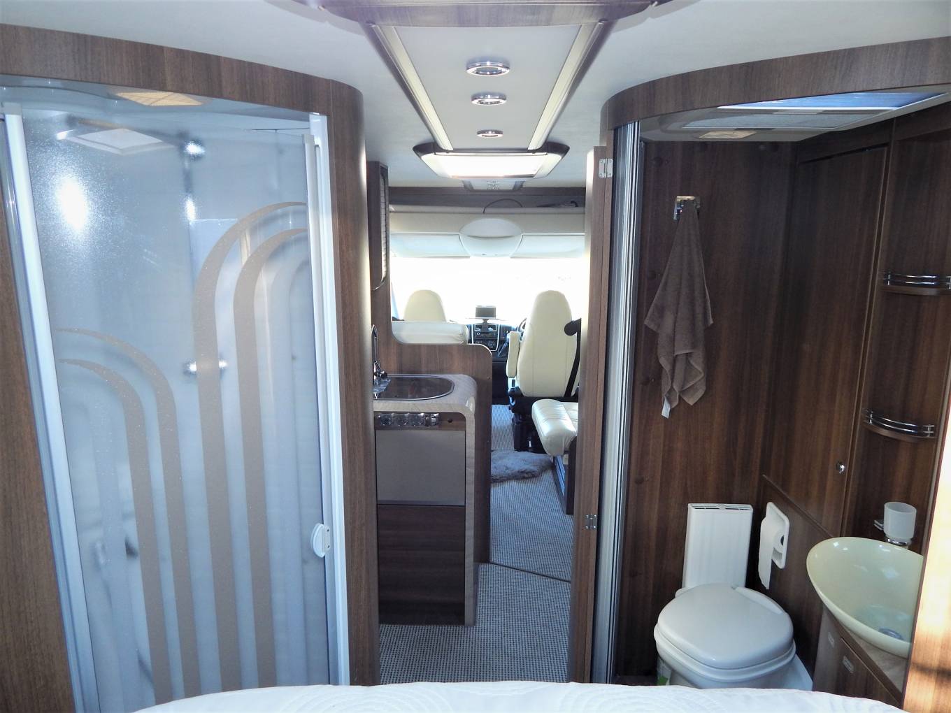 The Main bedroom area to the rear can be separated from the front with a solid closing door, Drivers Side there is a Fresh water flush Thetford toilet with a swivel top, white sink with chrome mixer tap. On the opposite side is a separate shower area with perspex doors. The Island Bed layout has ample room either side to get round, there are fold down steps either side for ease of access to the bed, above on one side there is a hanging wardorbe and on the other a shelved unit. At the foot of the bed the mattress can be folded back to reveal a dressing table with mirrors & stool.