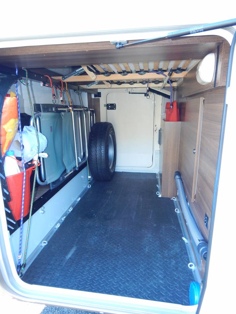To the exterior Drivers side; large garage door; Dometic Toilette Cassette access; outside BBQ point, 240v electric hook up, Exterior power point, under floor storage access.