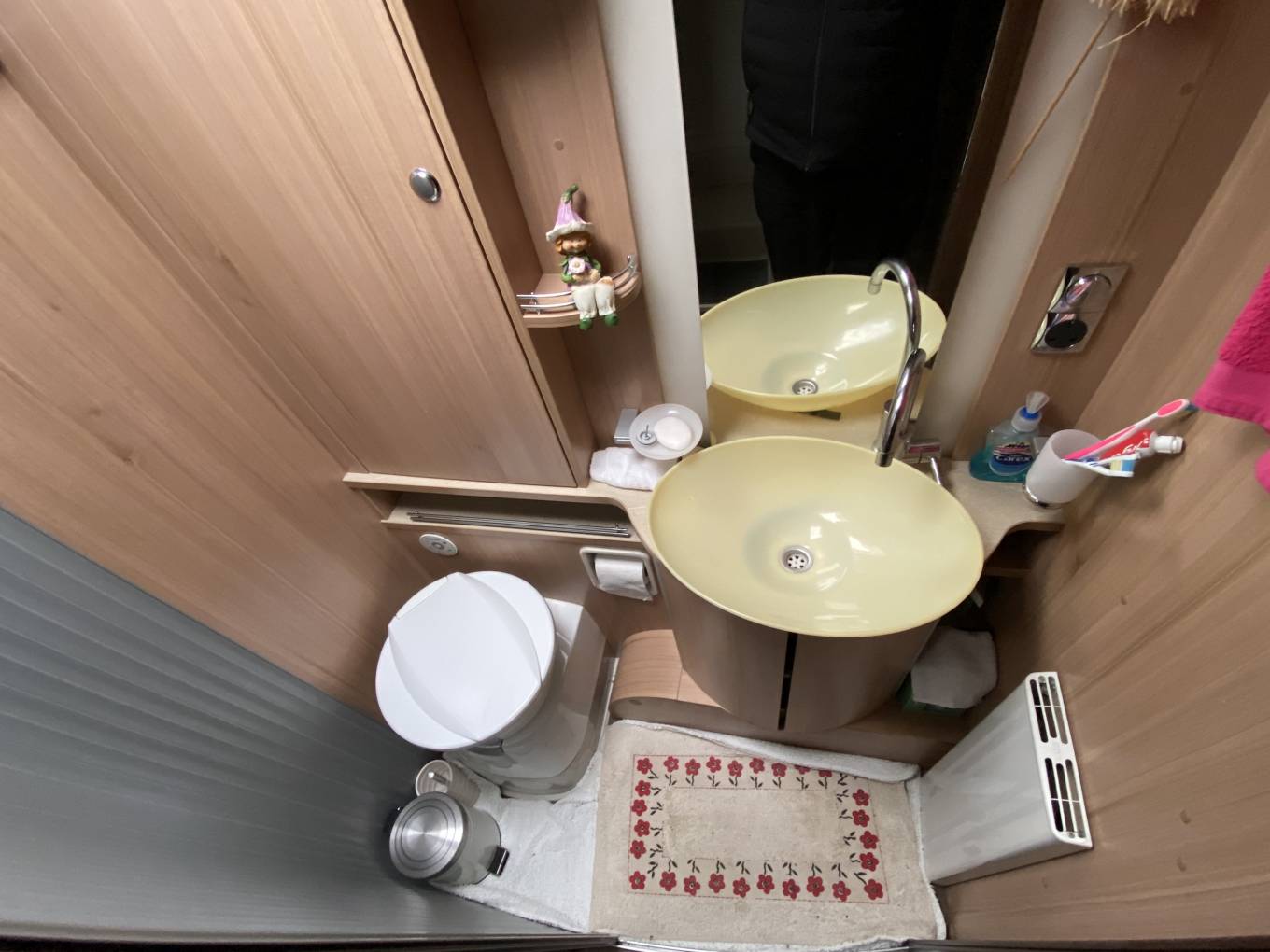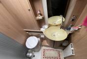 Through the sliding door towards the rear you will find the bathroom. On one side a Dometic toilet wash handbasin and cupboard space. On the other a spacious separate shower.