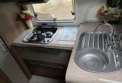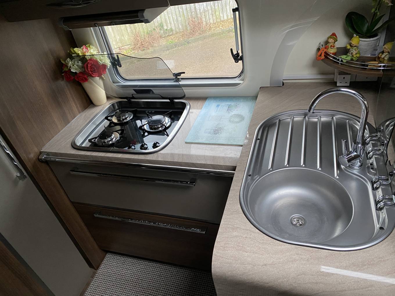 The kitchen is across the centre of the ‘van where there is a three gas burner hob, sink with drainer, a Dometic tower unit fridge, freezer and oven, plenty of worktop and a huge amount of cupboard space.