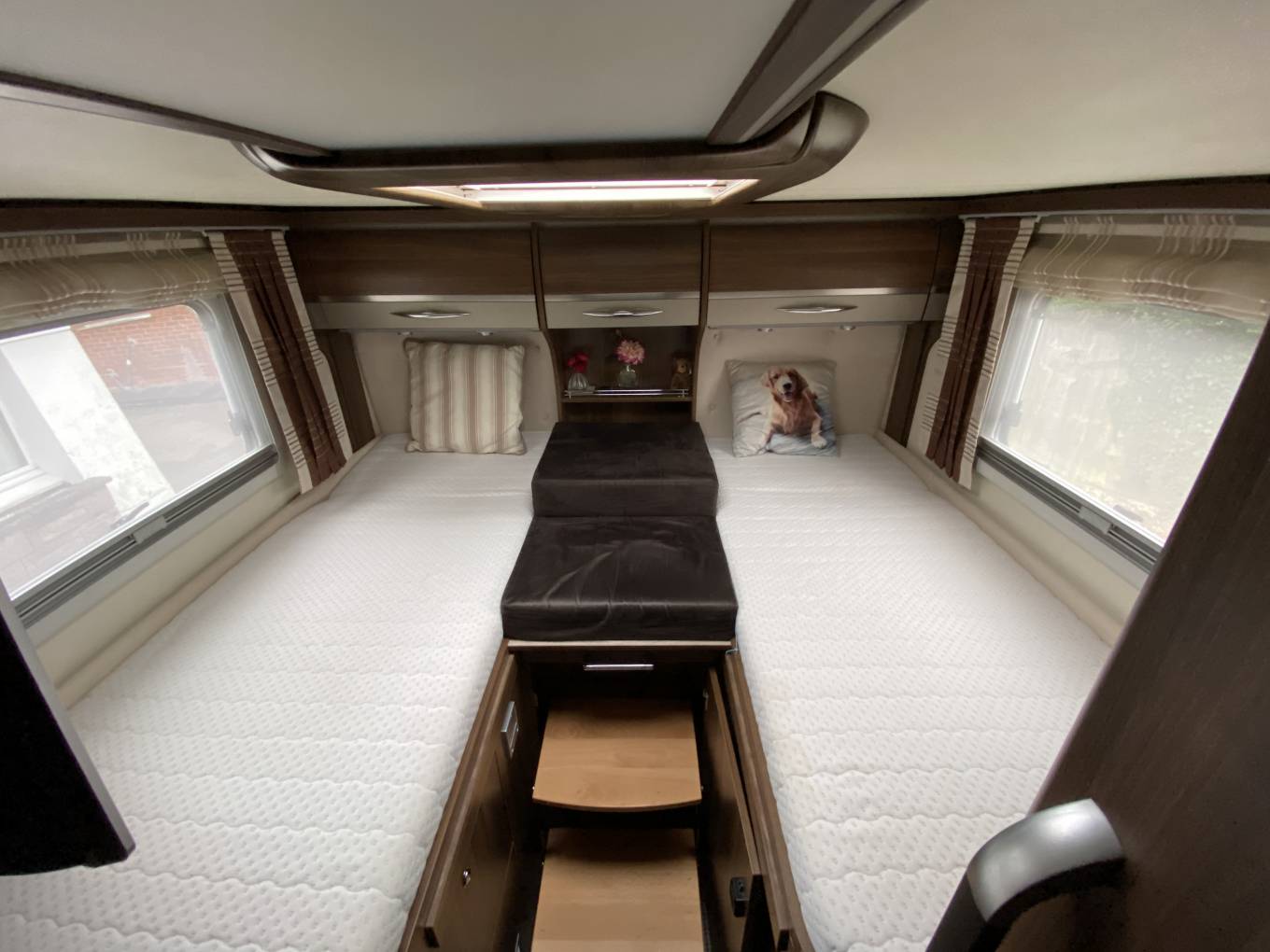 Moving on to the rear is the Master Bedroom. Two single beds either side easily join up via a sliding panel above the twin steps to make an enormous double. A Further TV can be found here.