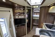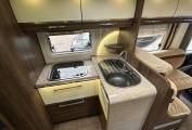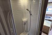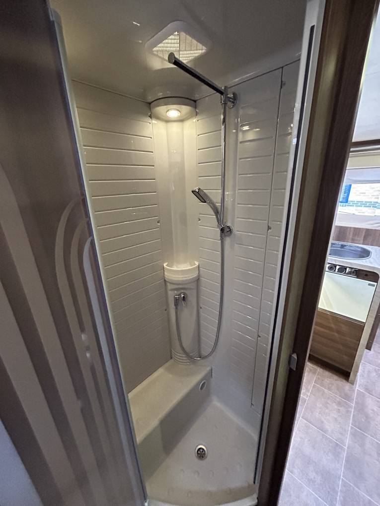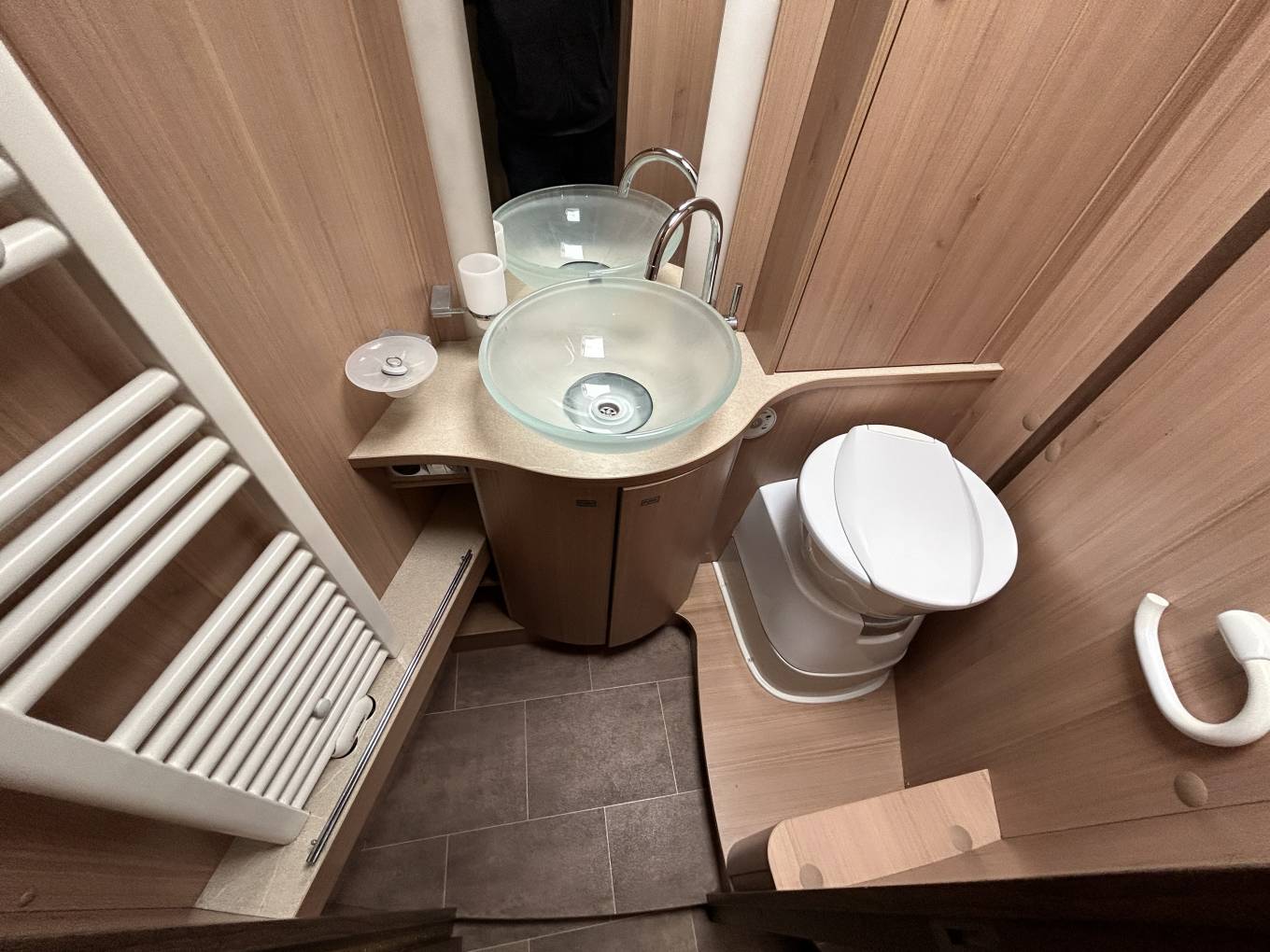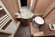 The Burstner Elegance i890 features a thoughtfully designed washroom and separate shower area. Enjoy the sink with a mixer tap and a stunning glass basin. The cassette toilet and wall units provide convenience and storage for your essentials. Step into the separate shower across the hall for a revitalizing experience that will leave you feeling refreshed and ready for new adventures.