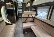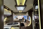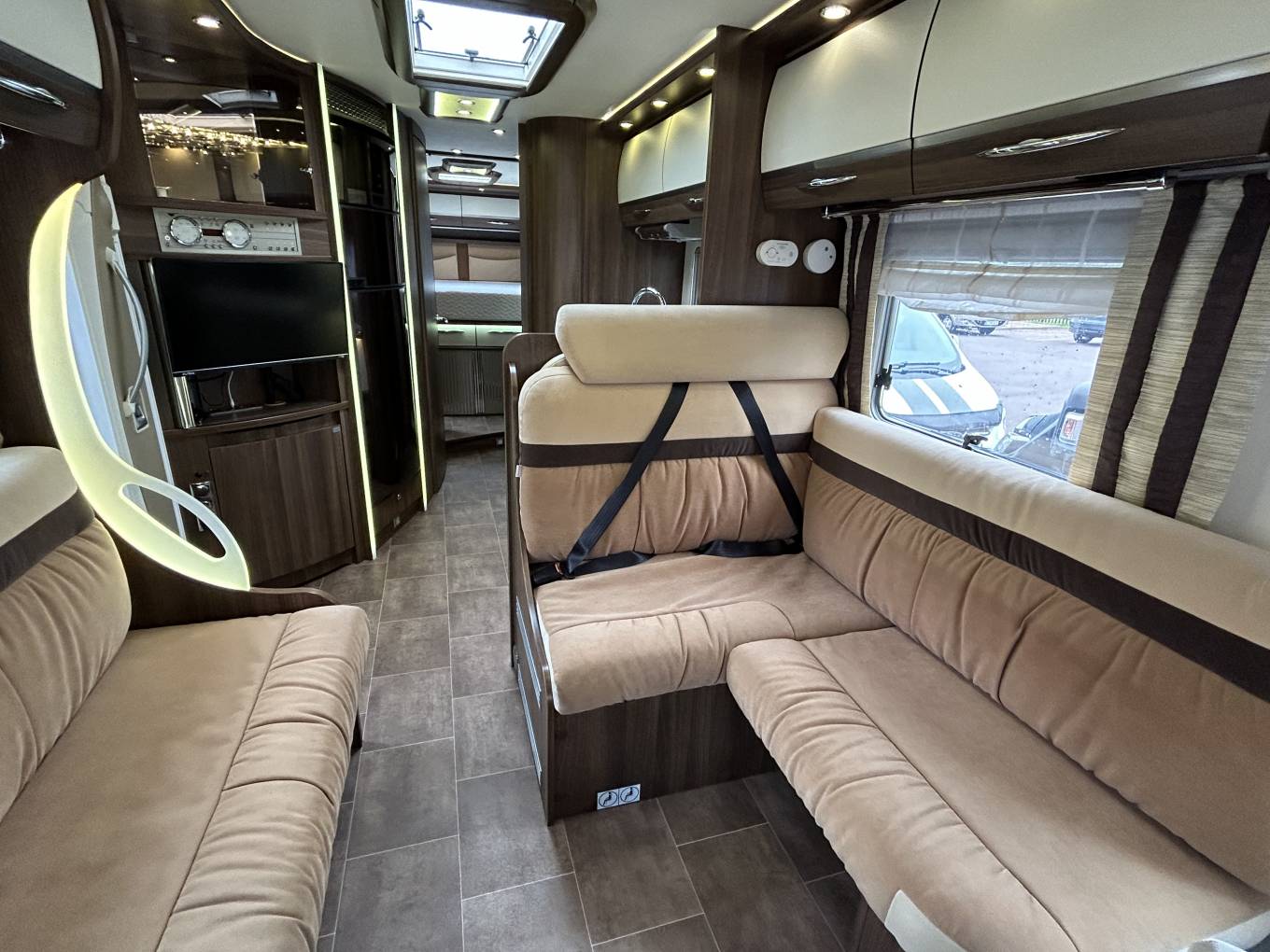 Step into the spacious and inviting interior, designed to create an atmosphere of pure bliss. The dining area boasts two forward-facing seats equipped with seat belts, perfect for enjoying meals while on the move. Side facing seats and a stylish dining table provide a cosy setting for relaxing evenings with your loved ones. Admire the elegant wall units and revel in the soft lighting that sets the mood for unforgettable moments. Entertainment is taken care of with a TV, satellite, and WiFi, ensuring you stay connected and entertained wherever you roam. The dedicated wine glass cupboard adds a touch of sophistication to your travels.