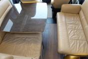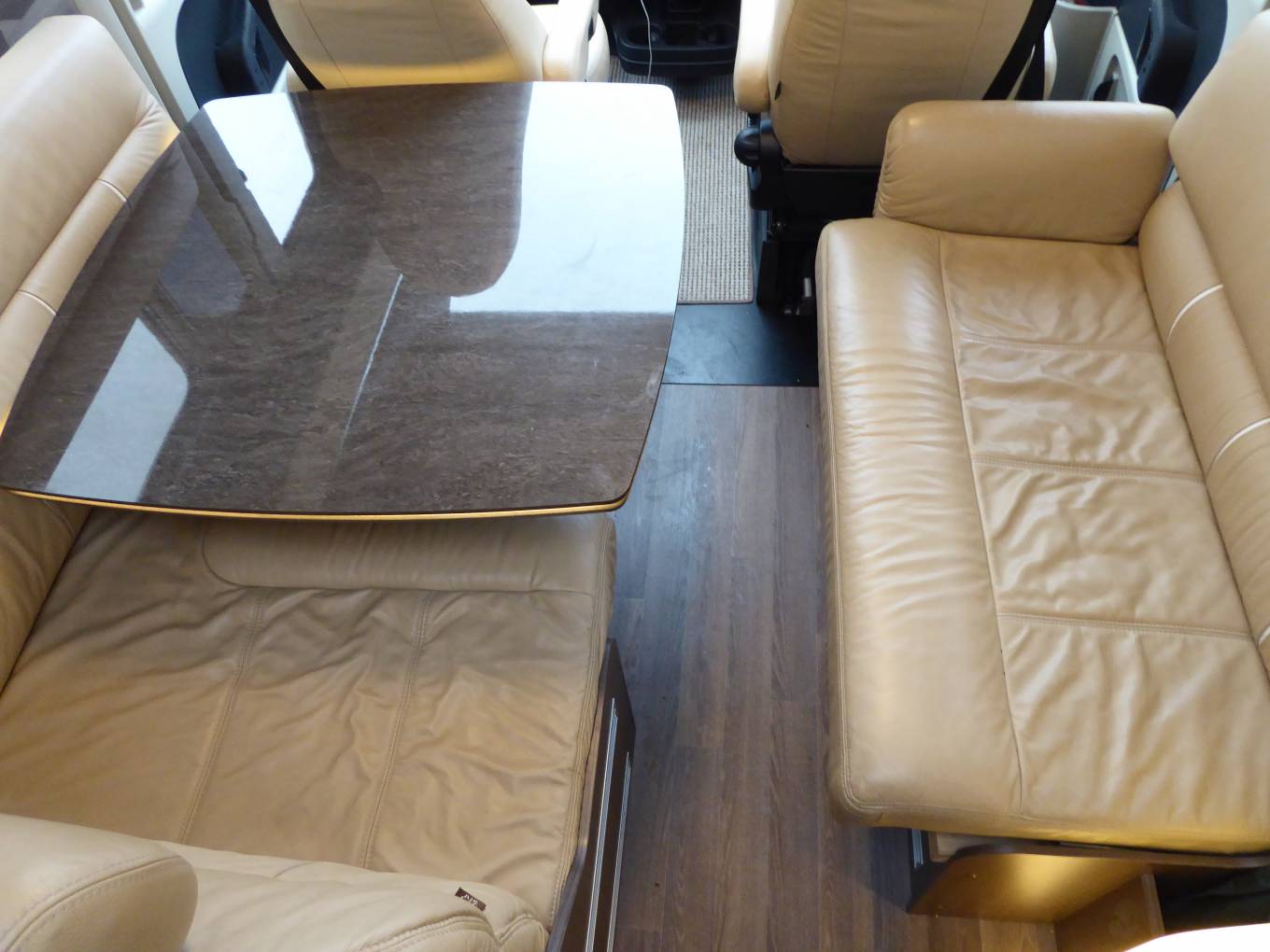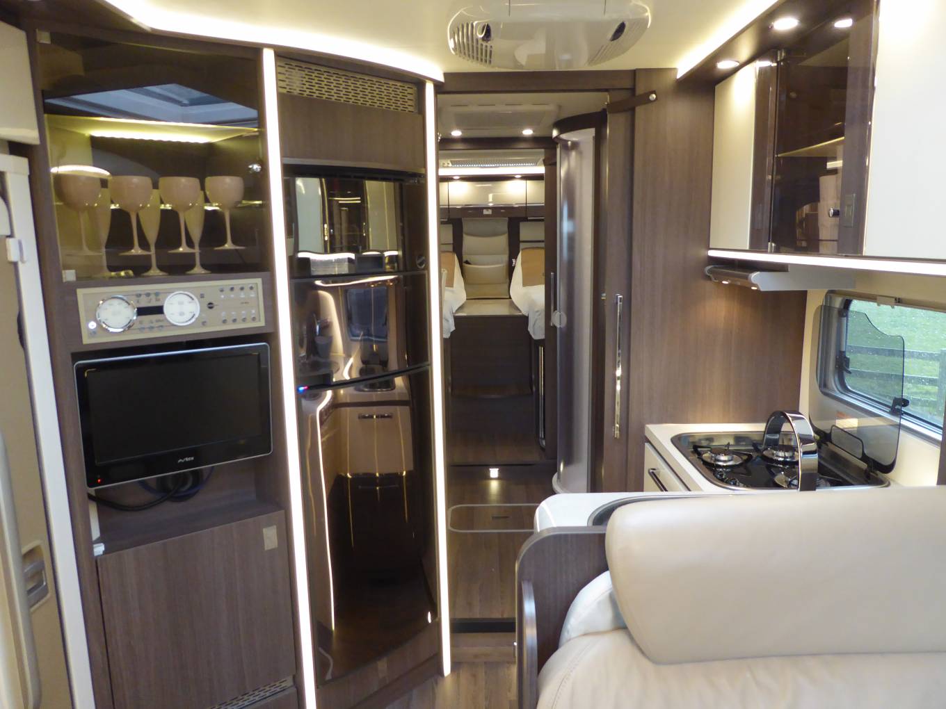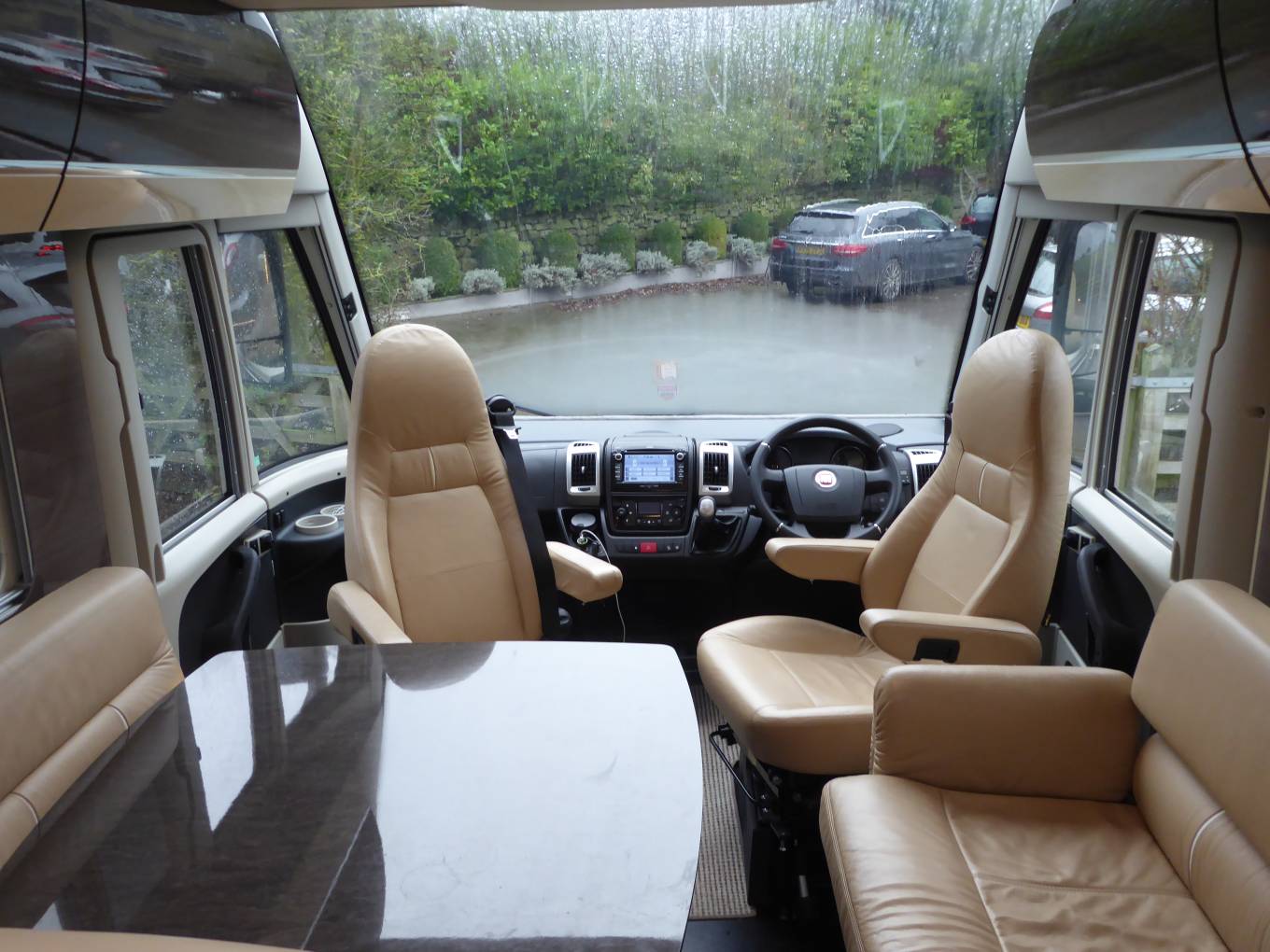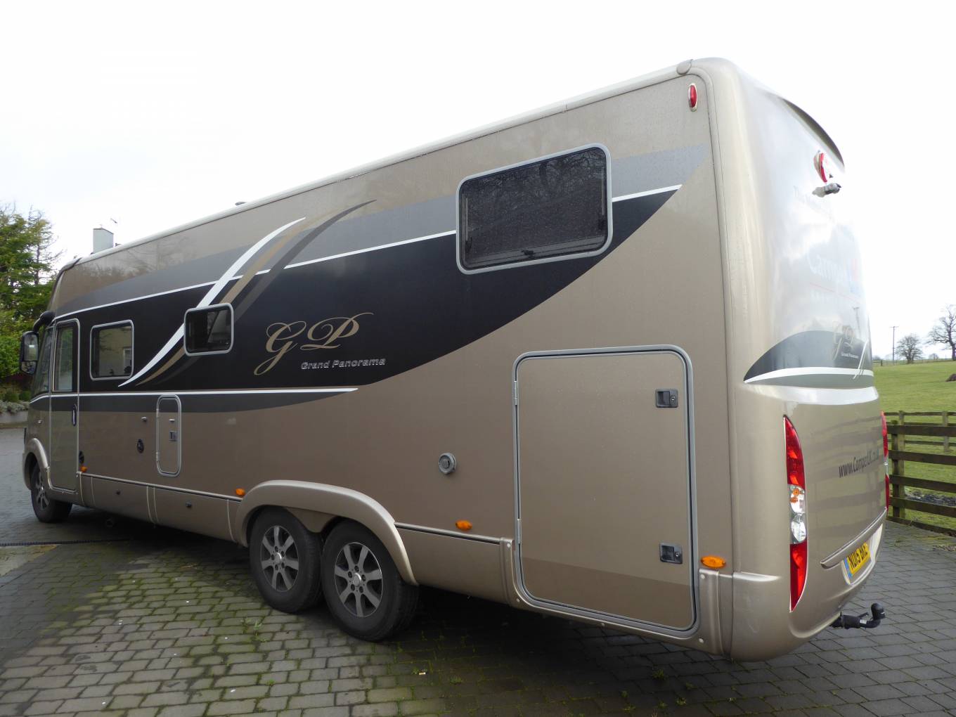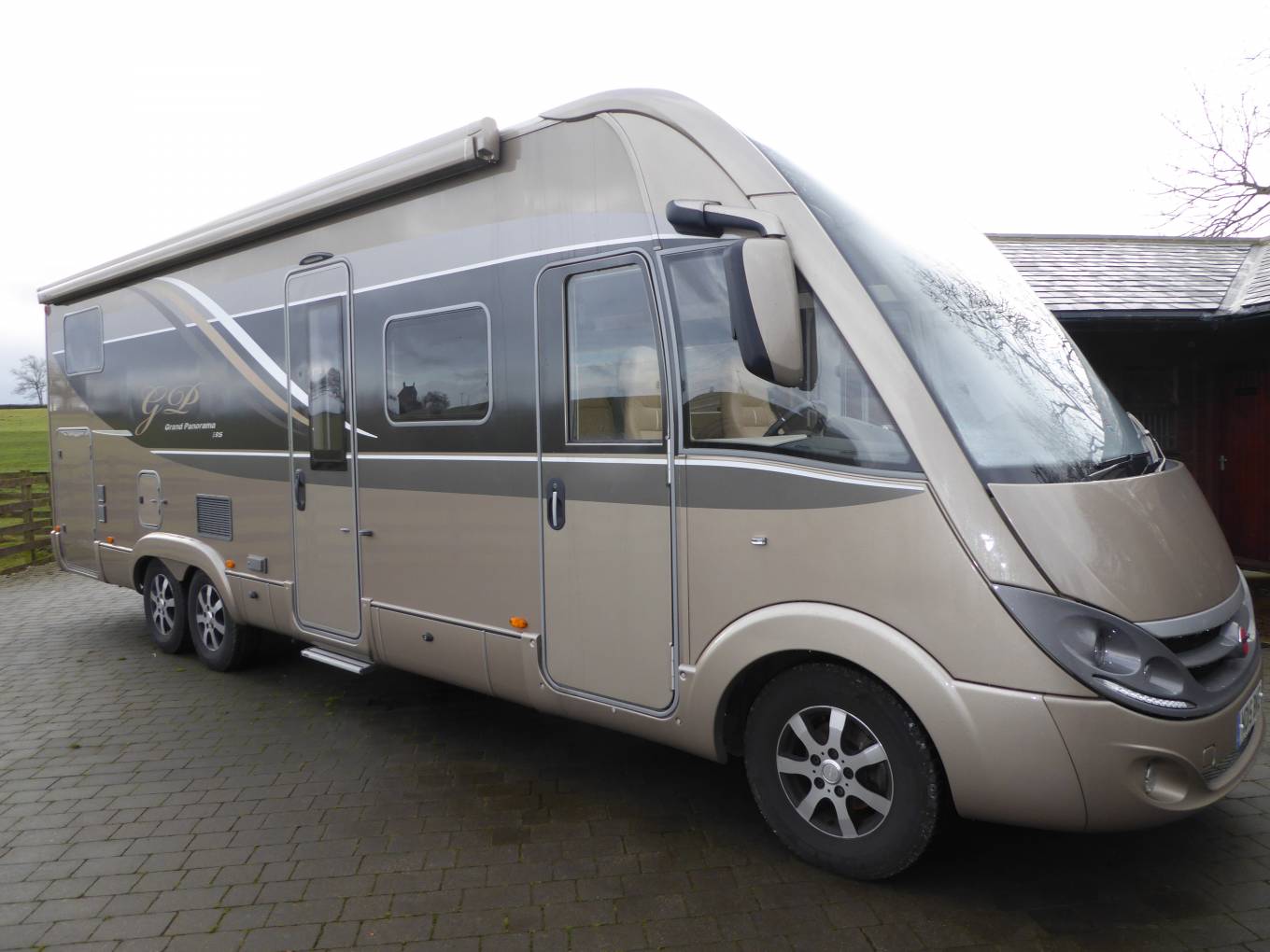Call with any questions on 01423 609985. This is a fantastic tag axle Burstner Grand Panorama i915, gold coloured, A class motorhome that comes to market very rarely. First registered in March 2015, it has travelled only 10,486 miles and is stunning both inside and out. Externally it benefits from a reversing camera, gas BBQ point, TV point, detachable tow bar and Thule Ominstar awning. At the rear you will find the garage with plenty of storage space both in terms of what you can see from the photos and further forward underneath the habitation floor. Internally it is luxurious, at the rear there are 2 single beds with 2 positions either laying fully flat or sitting more up right to watching TV or reading a book. All the fixtures and fittings have a fantastic high gloss finish throughout and there is plentiful storage space underneath each of the beds. There is a separate toilet and sink and then on the offside there is a shower room with full enclosure. All the above can be separated from the main habitation area with privacy doors. In the kitchen you will find a Dometic fridge and separate freezer with oven and grill above. Opposite is worktop with a 3 gas burner hob, sink, extractor fan and again the finish on the worktops is excellent. In the front lounge there is an L-shaped sofa with 2 forward facing full seatbelts and another sofa opposite these all come in a beautiful beige leather upholstery. Above you will find the Telair air conditioning system and electric drop down bed which is very easy accessible and there is still space underneath the bed when lowered, for someone to sit on the sofa later into the evening. In the cab both front seats swivel to create an ambient area for entertaining or relaxing. What sets this motorhome apart from the rest is the word panorama, the front windscreen is huge and gives a view that no other motorhome can match. It has electric screens for the panoramic window for night time and Remis blinds for all the other windows. It’s fully automatic with the Fiat Comfortmatic gearbox, has a Zenec multimedia centre including radio, DV, Bluetooth and satellite TV. There are 2 televisions, 1 of which is the rear bedroom and the other can be found in the habitation area next to the wine cabinet with storage for wine bottles and glasses. There is a heated front windscreen and heating can be circulated round the whole motorhome whilst on the move. It benefits from the Alde wet central heating system and has a tracker system fitted too. This really is a stunning motorhome and there are so few that ever come to market, so it should be viewed at the earliest opportunity near Harrogate, North Yorkshire. Part Exchanges welcomed on this vehicle, for further information and photos please call us on 01423 609985 quoting reference 86517