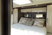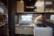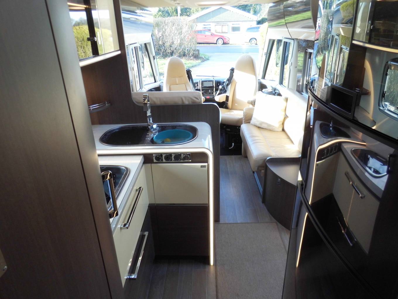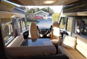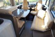 The stunning lounge/dinette is a fantastic place to relax and dine. The enormous panoramic front windscreen and the huge skylight allows loads of natural light to flood in. On one side there are 2 sofas in an L shape configuration and the forward facing sofa has two 3 point seat belts. On the other side is a 2 seater side facing sofa. The multi-directional sliding dining table can be manoeuvered in to multiple positions to suit your dining needs. The 2 leather heated Captain's chairs can swivel around to allow another 2 people to dine. Above the dinette area is a large electric drop down double bed measuring 76 x 58 inches.