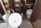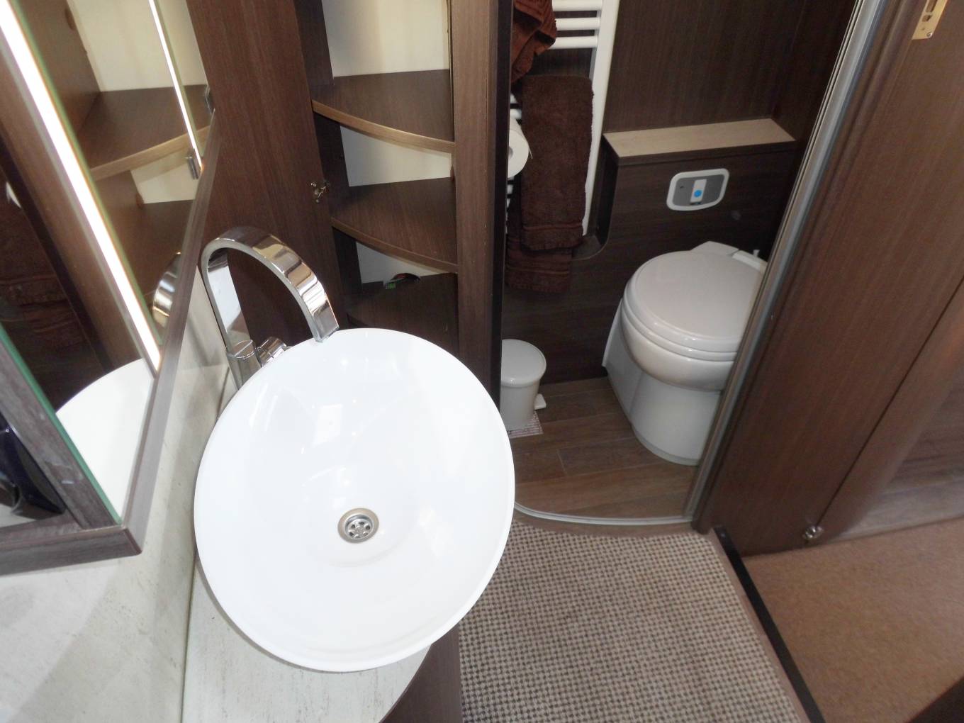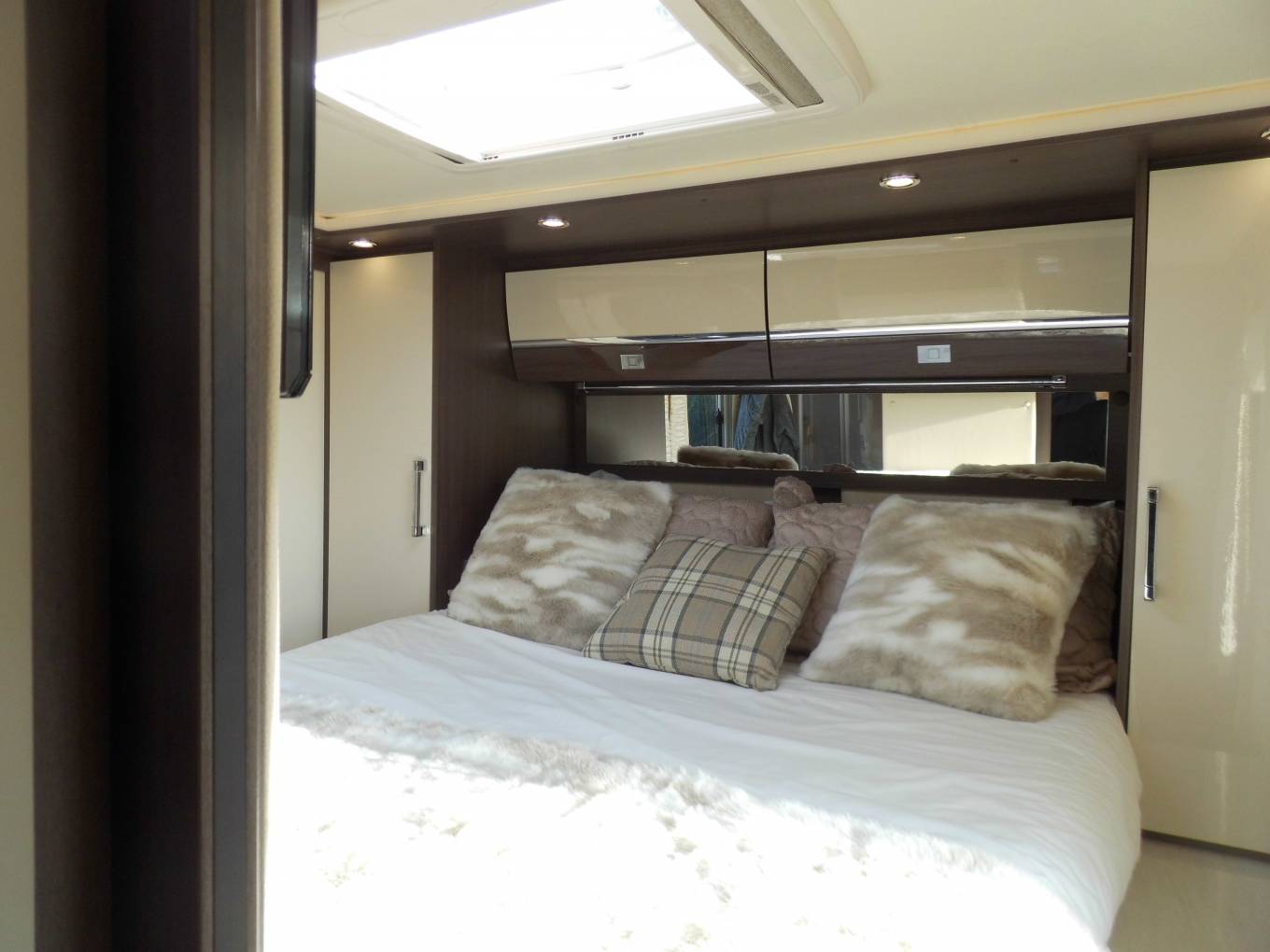 At the rear you have an ultra stylish bedroom with the highly desirable island bed layout which sits above the cavernous rear garage. The bed measures approximately 78 x 56 inches. There are his and her wardrobes either side of the bed and ample storage space in the overhead lockers. There is a TV on a bracket, a sliding bedroom privacy door and a large skylight. As you exit the bedroom you have a central wash basin with a mixer tap, mirror and a storage unit both above and underneath the basin. On the left hand side is the Thetford toilet with an electronic flush and a heated towel rail and next to this is a storage cupboard. On the opposite side is a large separate shower with a folding screen.