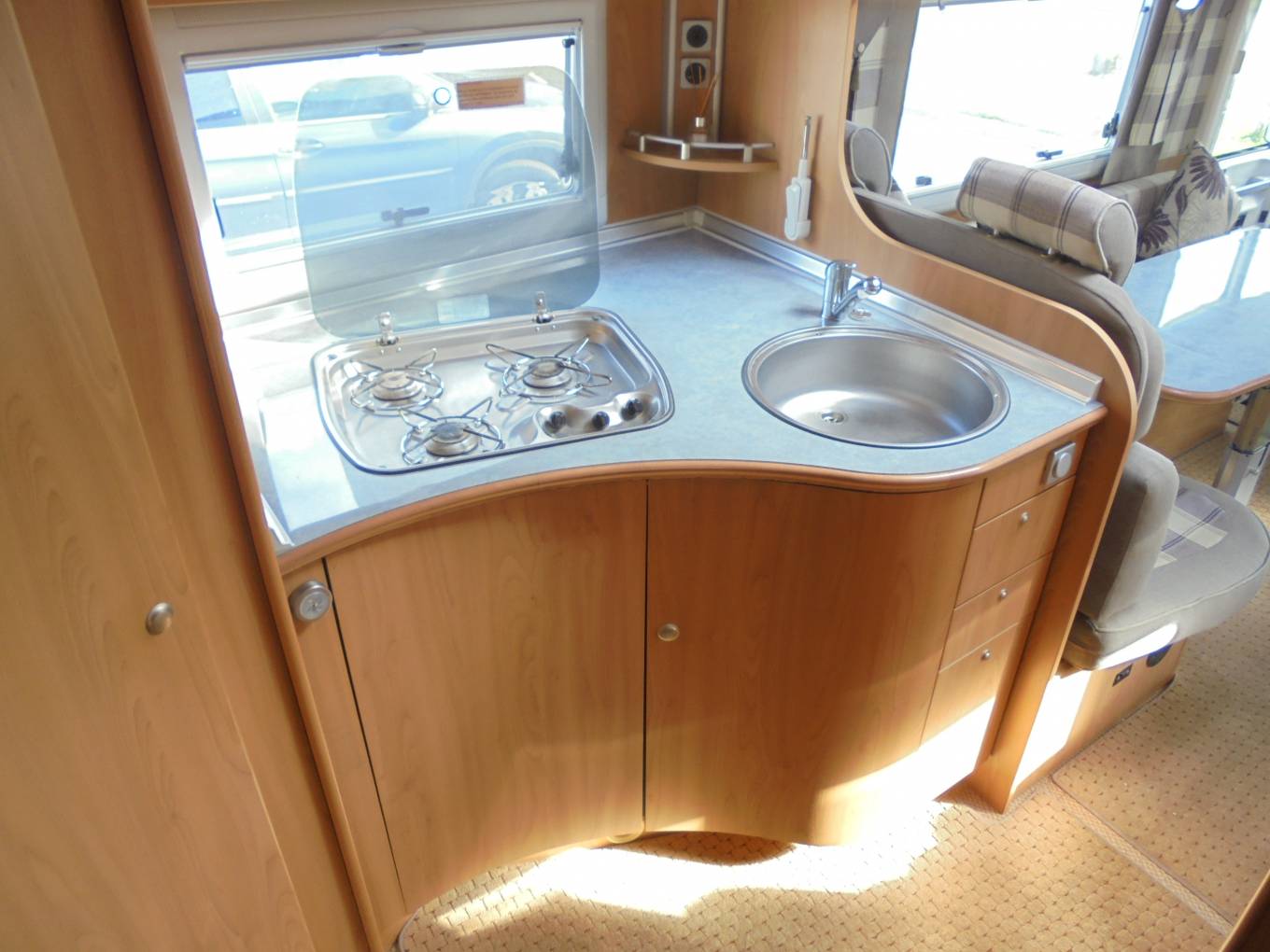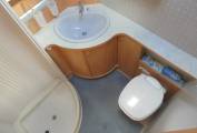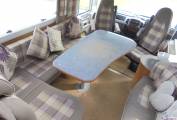 Kitchen area has ample worktop space with sink, hob with 3x gas rings, Smev oven-grill combi and large 3-way fridge with freezer compartment. Heating and hot water are provided by a Truma system, heating on gas, hot water on gas or electric. Adjustable dining table for lounge. Washroom has cassette toilet, standalone shower and sink unit. This motorhome has a TV DVD which is housed in a roll door cupboard, satellite receiver, LED lighting, loose fit carpets and window blinds throughout. Other features include swivel cab seats, cab air con and lots of internal and external storage space.